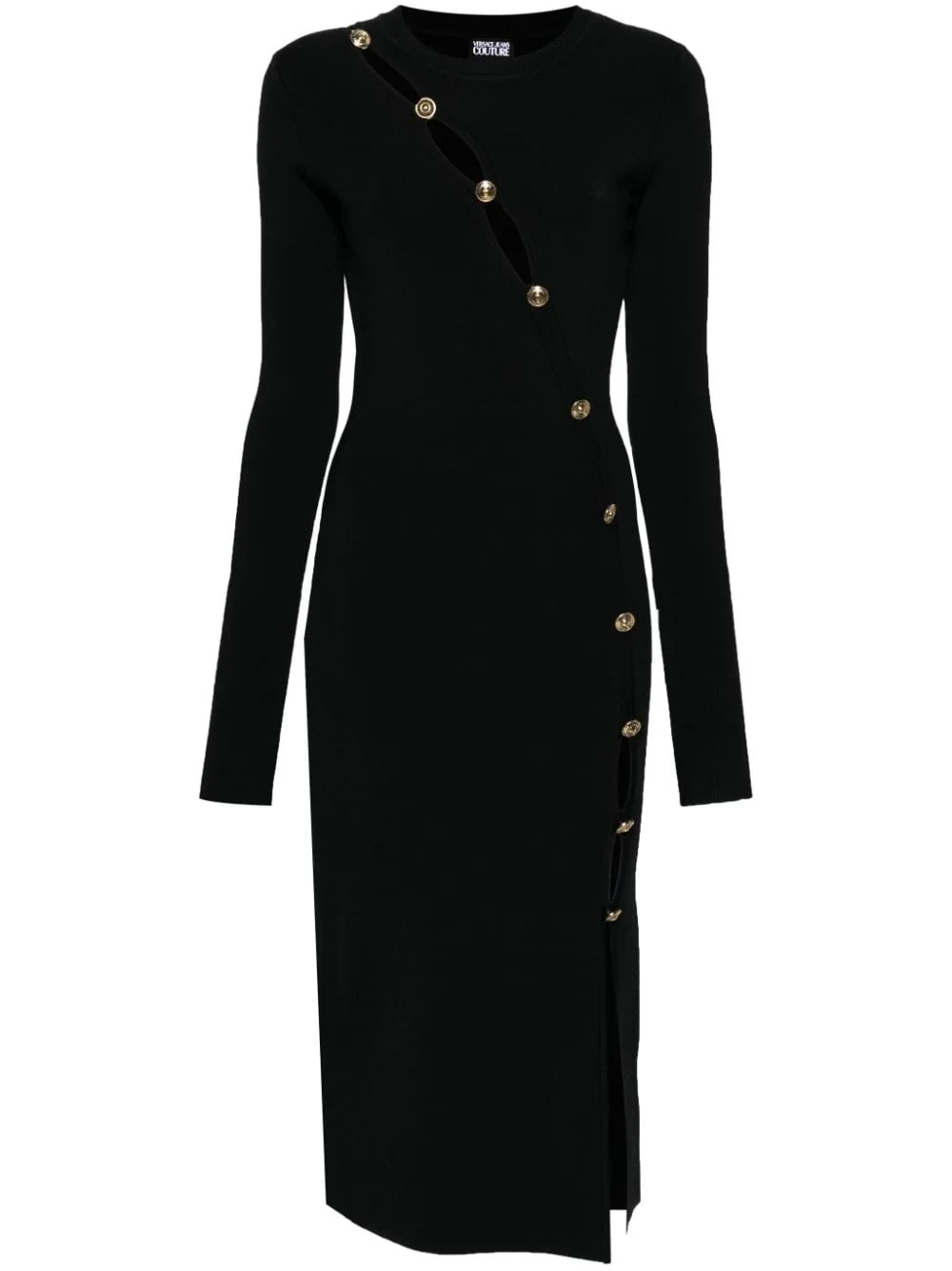 decorative-buttons knitted midi dress Highlights - Black - Knitted construction - Ribbed crew neck - Long sleeves - Cut-out detailing to the chest and thigh - Decorative button detailing - Logo-embossed gold-tone buttons - Front slit - Mid-calf length - Straight hem - Pull-on style Imported Composition Viscose 76%, Polyamide 24% SIZE & FIT Model measurements Height 5 ft 11 in(1.8 m) Bust/Chest 31.49 in(80 cm) Hips 36.61 in(93 cm) Waist 24.4 in(62 cm) FittingInformation Designed for a close fit throughout Made with a midweight knit, this piece offers some stretch This piece fits true to size – take your usual size