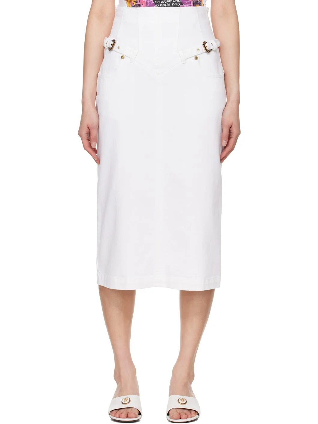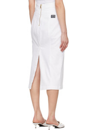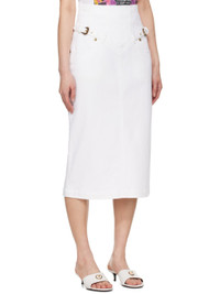 Stretch denim midi skirt. · Belt loops and pin-buckle straps at front · Two-pocket styling · Darts and zip closure at back waist · Logo patch at back · Central vent at back hem · Partially lined · Logo-engraved antiqued gold-tone hardware Supplier color: White Body: 99% cotton, 1% elastane. Lining: 65% polyester, 35% cotton. Made in Italy 251202F092002