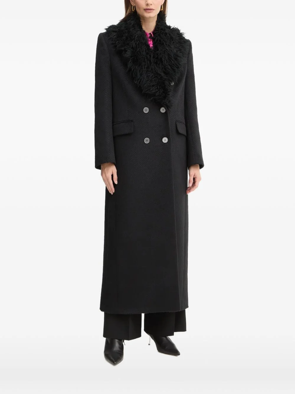 double-breasted coat Highlights - Black - Faux-fur collar - Double-breasted button fastening - Two front flap pockets - Long sleeves - Long-length Imported Composition Fabric 100% Washing instructions Read Manufacturer Guidelines