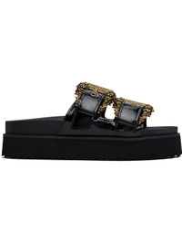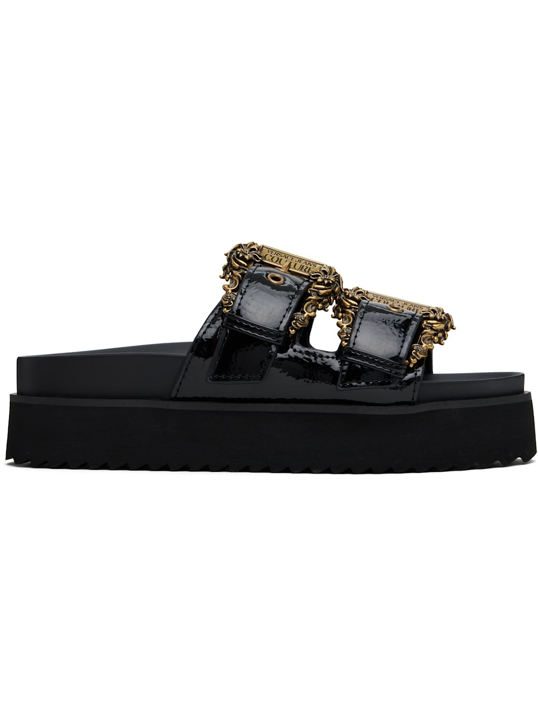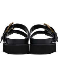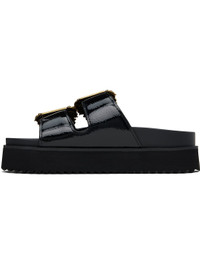 Patent faux-leather flat sandals in black. · Open toe · Pin-buckle strap at vamp · Logo stamp at molded footbed · Foam rubber platform midsole · Treaded rubber sole · Platform: H1.75" Supplier color: Black Upper: synthetic. Sole: rubber. Made in China 251202F124010