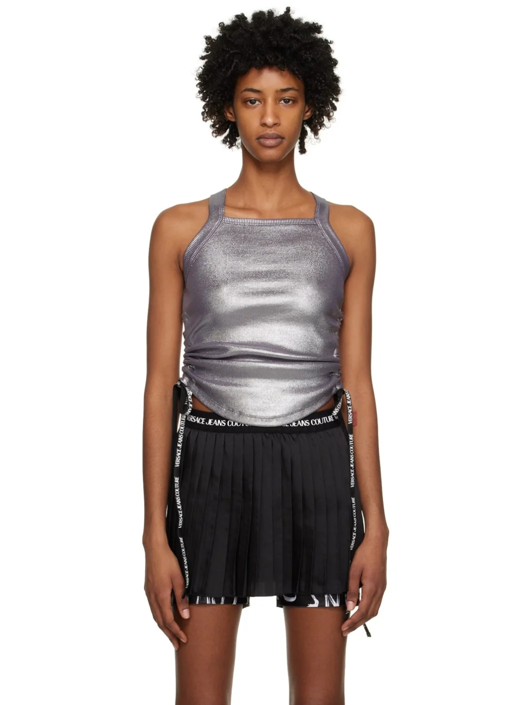 Resin-coated rib knit stretch nylon tank top. · Square neck · Ruching and self-tie straps at side seams · Logo patch at back collar Supplier color: Silver Body 1: 97% polyamide, 3% elastane. Body 2: 100% polyurethanic resin. Made in Italy 231202F111002