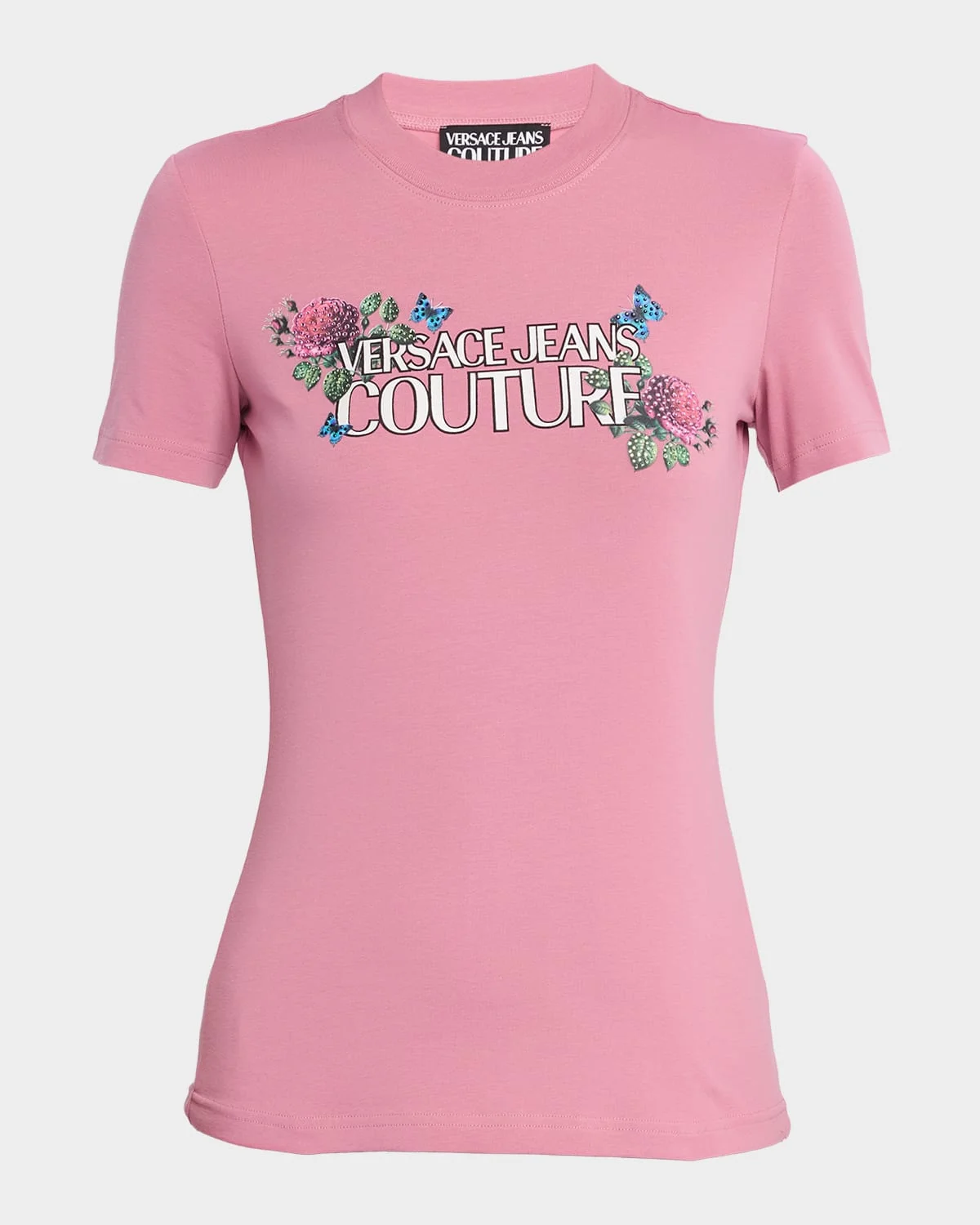 Versace Jeans Couture tee adorned with an embellished floral logo print Crew neckline Short sleeves Easy fit Hem sits at the hip Pullover style Cotton/elastane Dry clean Imported