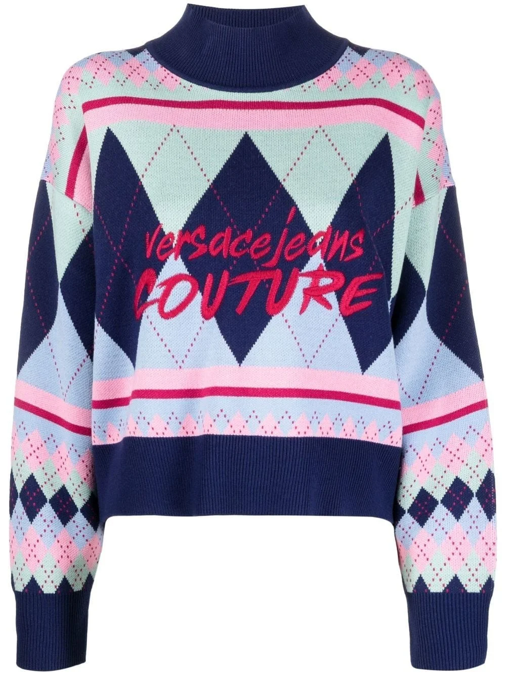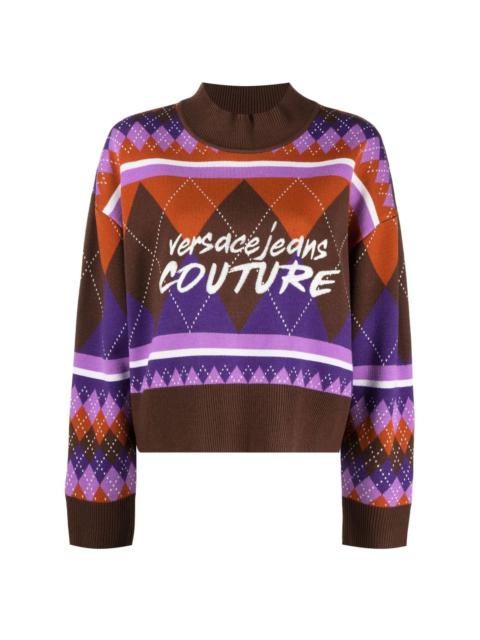 argyle-knit logo-embroidered jumper Designed with a multicolour argyle knit construction; this wool-blend jumper forms part of the Versace Jeans Couture AW22 collection. Built with a mock neck and classic ribbed trims, the eye-catching silhouette is finished with an embroidered logo at the chest. Imported Composition Acrylic 70%, Wool 30% SIZE & FIT Model measurements Height 5 ft 9 in(1.76 m) Bust/Chest 33.07 in(84 cm) Hips 34.64 in(88 cm) Waist 25.59 in(65 cm) FittingInformation This piece fits true to size. We recommend you get your regular size Cut for a loose fit Made with a mid-weight fabric Washing instructions Hand Wash