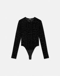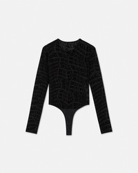 DETAILS A longsleeved bodysuit in a sheer mesh featuring an allover tonal velvetflocked Liquify Logomania motif - Liquify Logomania motif - Long sleeves - Round neckline - Hook-and-eye closure - Outer composition: 94% Polyester, 6% Elastane Item: E79HAM221-EJS490_E899