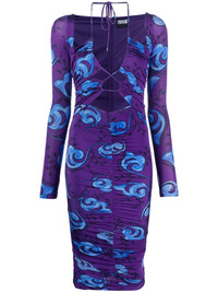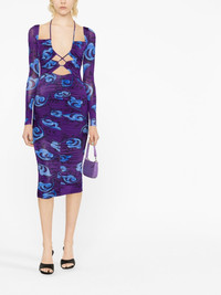 floral-print midi dress Versace Jeans Couture follows in the steps of mainline collections with its bold prints and daring silhouettes. As is the case with this SS23 midi dress, with its bright purple and blue floral print and slinky, cut-out silhouette. Highlights - Purple/blue - Stretch-design - All-over floral print - Gathered detailing - Cut-out detailing - Halterneck tie fastening - Long sleeves - Mid-calf length - Concealed rear zip fastening - Straight hem Made in Italy Composition Outer: Viscose 96%, Spandex/Elastane 4% Lining: Polyamide 100% SIZE & FIT Model measurements Height 5 ft 10 in(1.79 m) Bust/Chest 31.49 in(80 cm) Hips 35.03 in(89 cm) Waist 23.62 in(60 cm) FittingInformation Designed for a close fit throughout The adjustable drawstring means that you can adjust this piece’s fit to suit your comfort and preference Made from a midweight stretch fabric, this piece offers elasticity and flexibility when worn This piece fits true to size – take your usual size Washing instructions Dry Clean Only