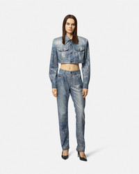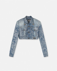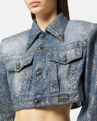 DETAILS This cropped denim jacket features an all-over Animalier motif with lurex threading throughout. It has padded, rounded shoulders, the Piece Number logo tag at the front hem and Western style collar tips. - Animalier motif - V-Emblem hardware - Piece Number logo label - Western-style collar tips - Pointed collar - Long sleeves - Front flap pockets - Belt loops - Button closure - Outer composition: 100% Cotton - Lining: 65% Polyester, 35% Cotton Item: E76HAS458-EDS013M30_E904 SIZE & FIT - The model is 5'10" tall and wears size 40 - All sizes fit Italian standards