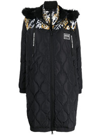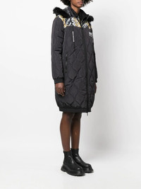 graphic-print quilted coat black quilted graphic print to the front faux-fur detailing high neck front zip fastening long sleeves two side zip-fastening pockets mid-length Imported Composition Outer: Polyester 100% Lining: Polyester 100% SIZE & FIT Model measurements Height 5 ft 10 in(1.77 m) Bust/Chest 29.92 in(76 cm) Hips 34.25 in(87 cm) Waist 23.62 in(60 cm) FittingInformation This piece fits true to size. We recommend you get your regular size Cut for a loose fit Made with a mid-weight non-stretch fabric
