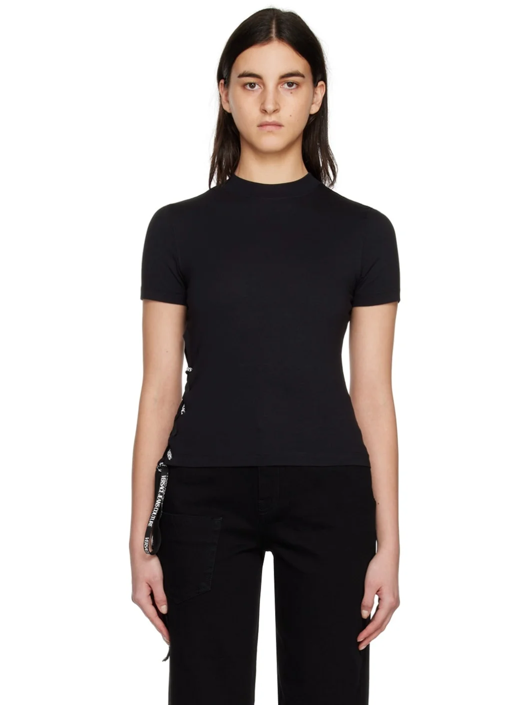 Stretch cotton jersey T-shirt. · Rib knit crewneck · Lace-up detailing at vented side seam · Logo patch at back collar Supplier color: Black 96% cotton, 4% elastane. Made in Italy 231202F110024