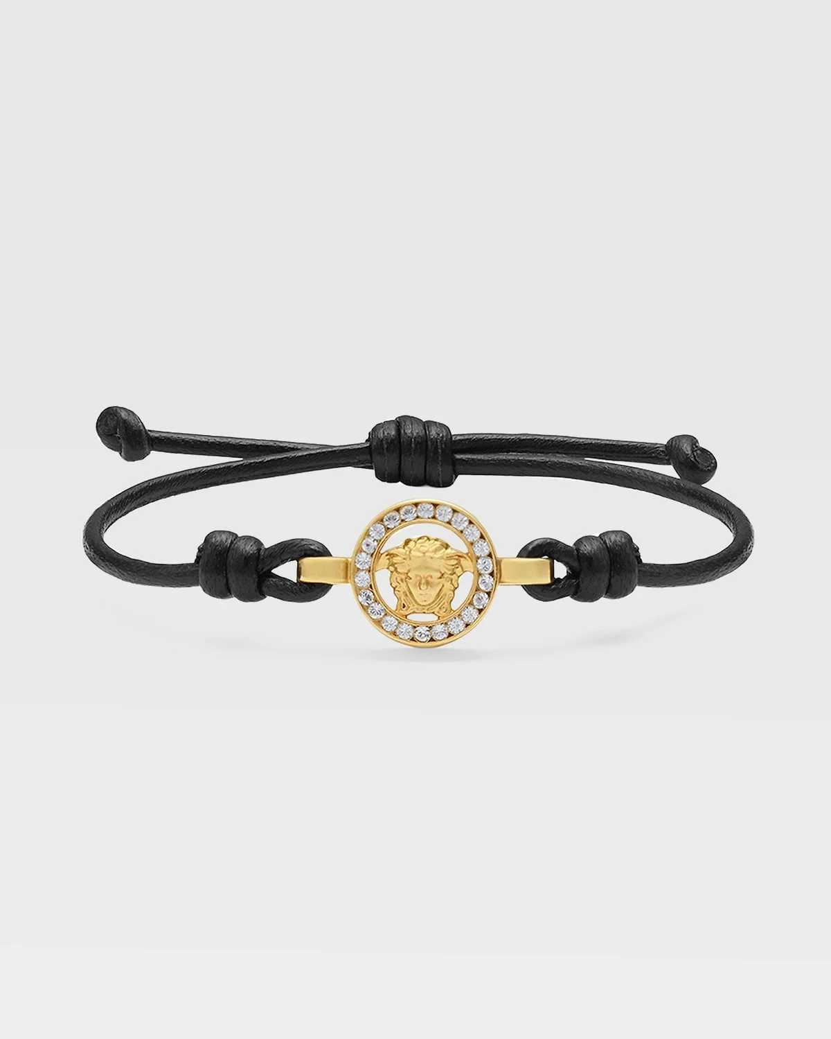Crafted of leather, this bracelet from Versace features the label's signature Medusa in a halo of sparkling strass Adjustable fit Strass/metal alloy/leather Made in Italy