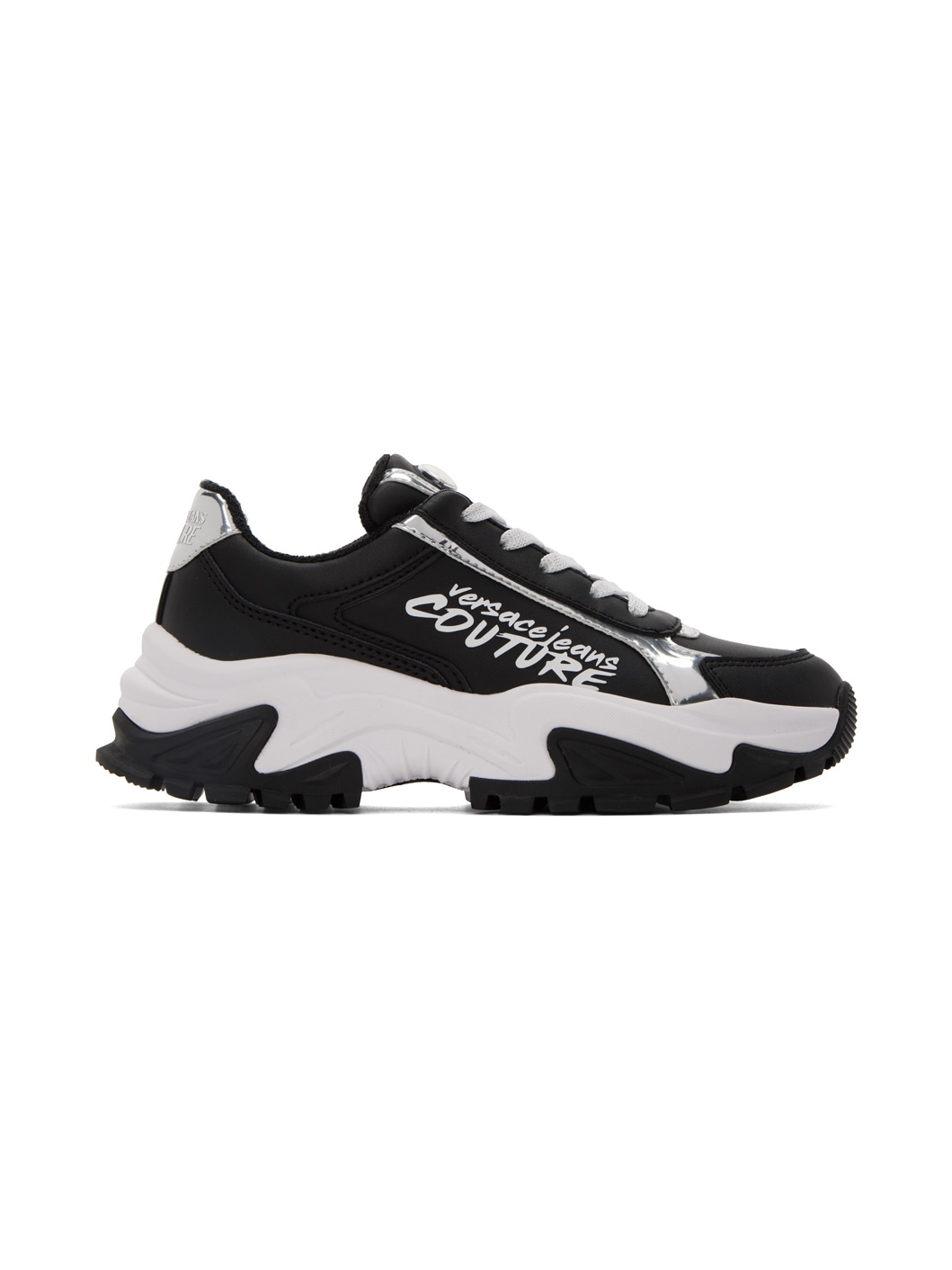 Low-top paneled buffed calfskin sneakers in black featuring trim in silver-tone and white. · Lace-up closure · Rubberized logo at padded tongue · Padded collar · French terry lining · Logo-bonded textile patch at heel tab · Logo printed at outer side in white · Textured rubber midsole in white · Treaded rubber outsole in black Supplier color: Black Upper: leather, textile. Sole: rubber.