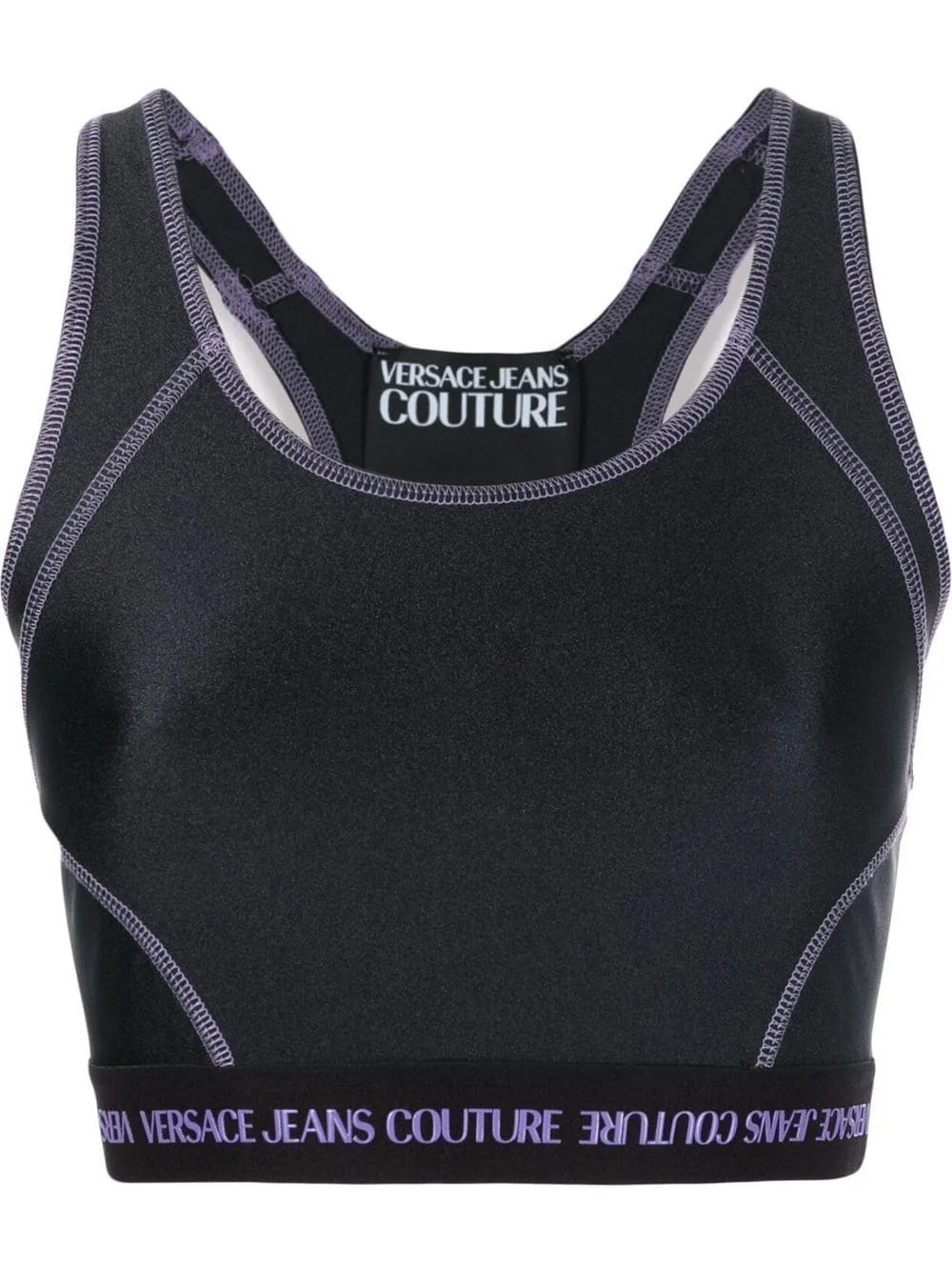 logo-band crop top Versace Jeans Couture showcases its branding-focused aesthetic with this sleeveless cropped top. This design is imagined in a black colourway and finished with a logo print to the waistband, illustrating the label's propensity for branding. Imported Composition Polyamide 80%, Spandex/Elastane 20% SIZE & FIT Model measurements Height 5 ft 10 in(1.79 m) Bust/Chest 31.1 in(79 cm) Hips 35.03 in(89 cm) Waist 24.01 in(61 cm) Washing instructions Machine Wash