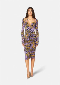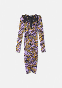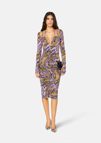 This long-sleeved midi dress has a plunging V neckline with a halter-like tie detail and features an all-over Logo Brush Couture print and a ruched skirt. DETAILS & CARE - Logo Brush Couture print - Plunging neckline - String tie detail - Ruche detail - Outside:95% Viscose, 5% Elastane - Lining:100% Nylon - Hand wash gently using mild detergent - Do not bleach - Do not tumble dry - Line drying in the shade - Cool iron with damp cloth on top - Delicate dry clean SIZE & FIT - All sizes fit Italian standards