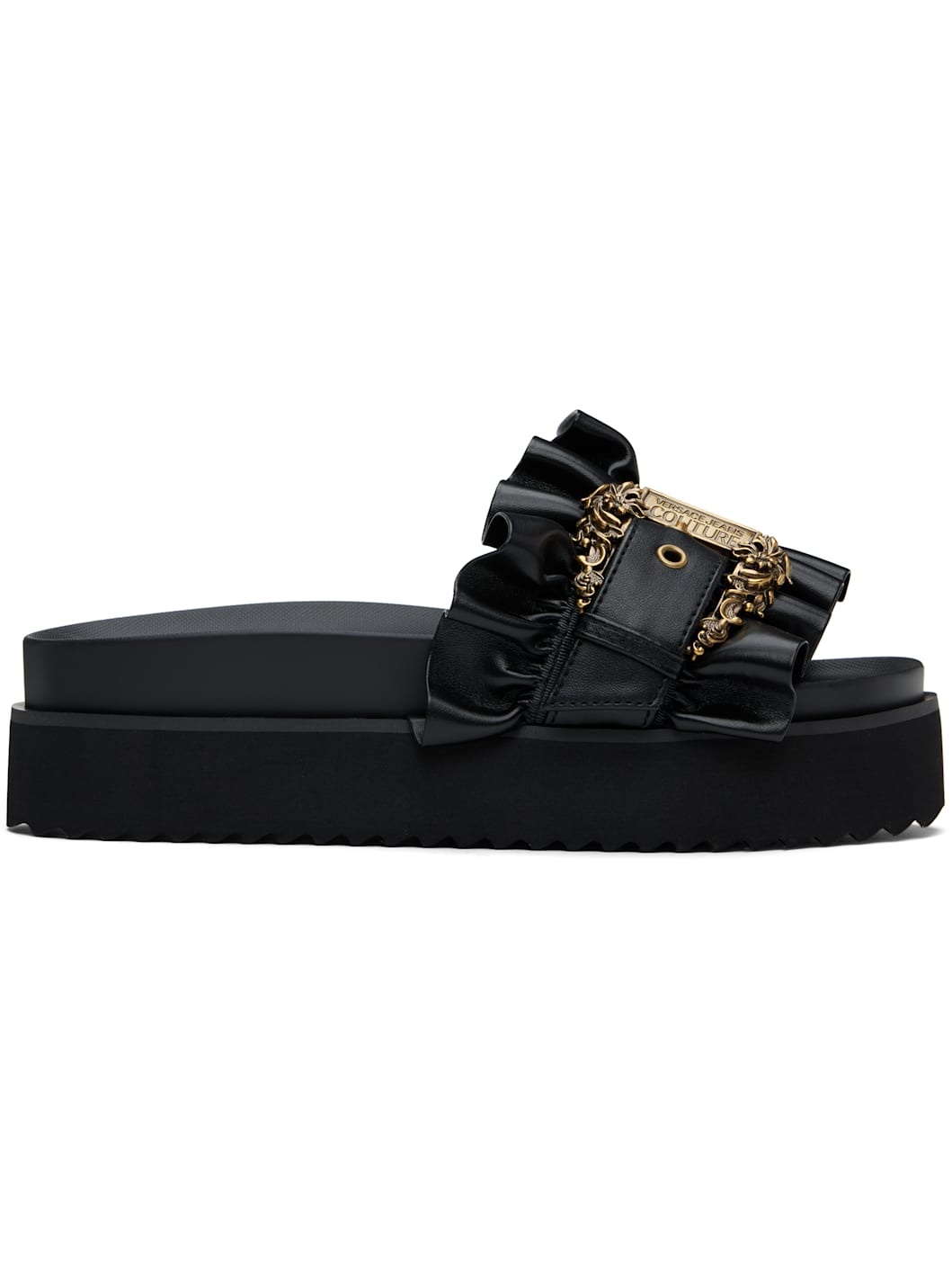 Buffed faux-leather flat sandals in black. · Open toe · Pin-buckle strap with ruffled trim · Logo stamp at molded footbed · Foam rubber platform midsole · Treaded rubber sole · Platform: H1.75" Supplier color: Black Upper: synthetic. Sole: rubber. Made in China 251202F124013