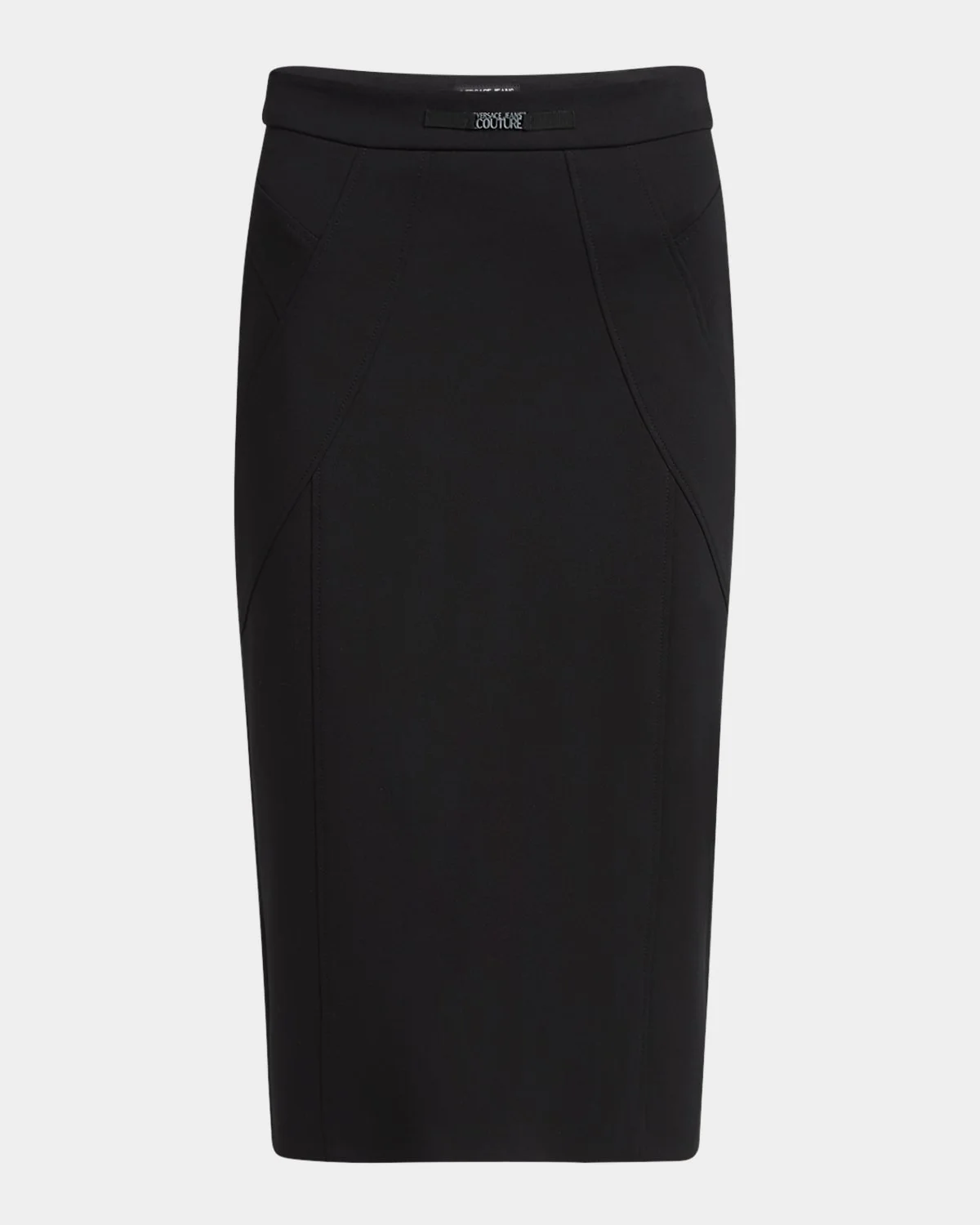 Versace Jeans Couture stretch knit midi skirt adorned with signature logo hardware High rise Elastic waistband Bodycon silhouette Center back vent Pullon style Viscose/nylon/polyamide/elastane Hand wash or dry clean Imported