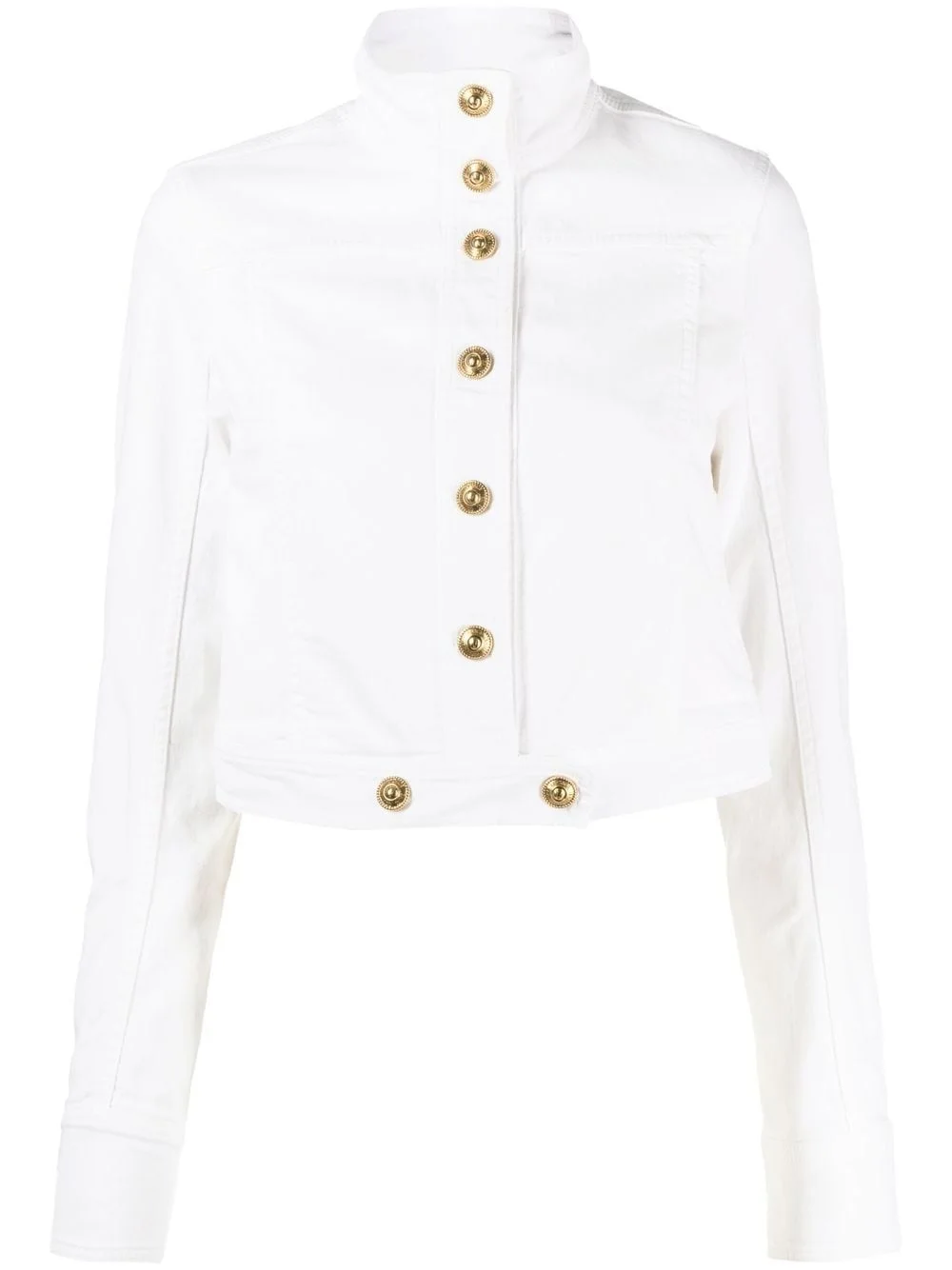 logo-patch cropped jacket white stretch-cotton logo patch to the rear gold-tone buttons high neck front button fastening long sleeves buttoned cuffs cropped Made in Italy Composition Outer: Cotton 98%, Spandex/Elastane 2% Lining: Cotton 100% SIZE & FIT Model measurements Height 5 ft 11 in(1.8 m) Bust/Chest 33.07 in(84 cm) Hips 37.4 in(95 cm) Waist 25.19 in(64 cm) FittingInformation This piece fits true to size. We recommend you get your regular size Cut for a slim fit Made with a mid-weight stretch fabric Washing instructions Machine Wash