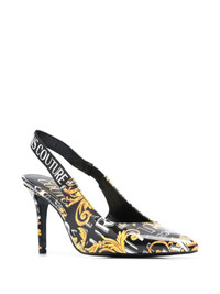 logo-print 90mm slingback pumps logo-print 90mm slingback pumps from VERSACE JEANS COUTURE featuring black, gold-tone, faux leather, all-over logo print, pointed toe, elasticated slingback strap, branded insole and high heel. Imported Composition Lining: Polyurethane 100% Sole: Rubber 100% Outer: Polyurethane 100% SIZE & FIT Measurement HEEL 3.7 in(9.5 cm)