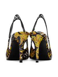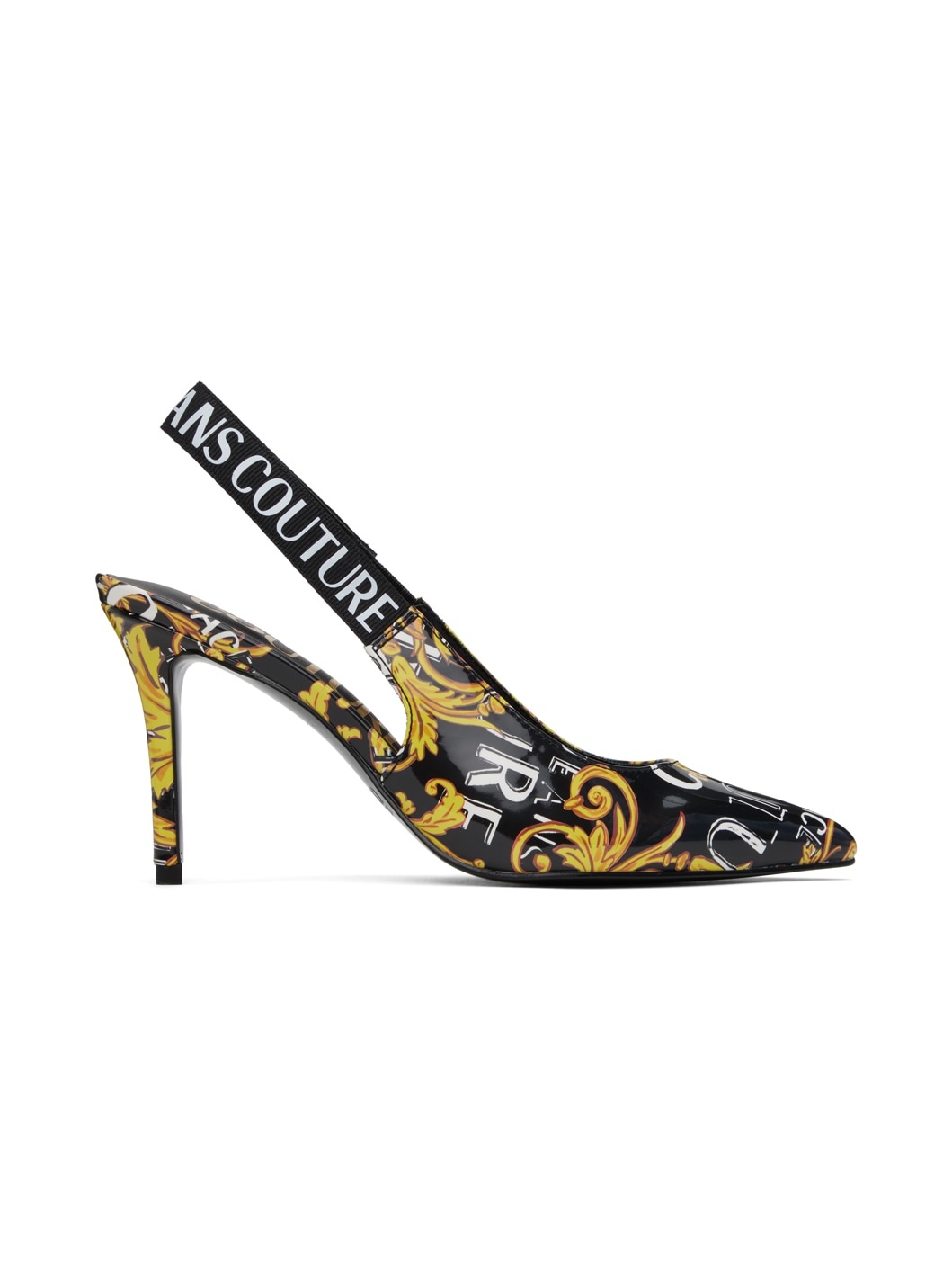 Patent faux-leather heels in black and gold. Logo graphic pattern printed throughout. · Pointed toe · Logo-bonded elasticized slingback strap · Covered stiletto heel with rubber injection · Treaded faux-leather sole · Gold-tone hardware · Heel: H3.25 in Supplier color: Black/Gold