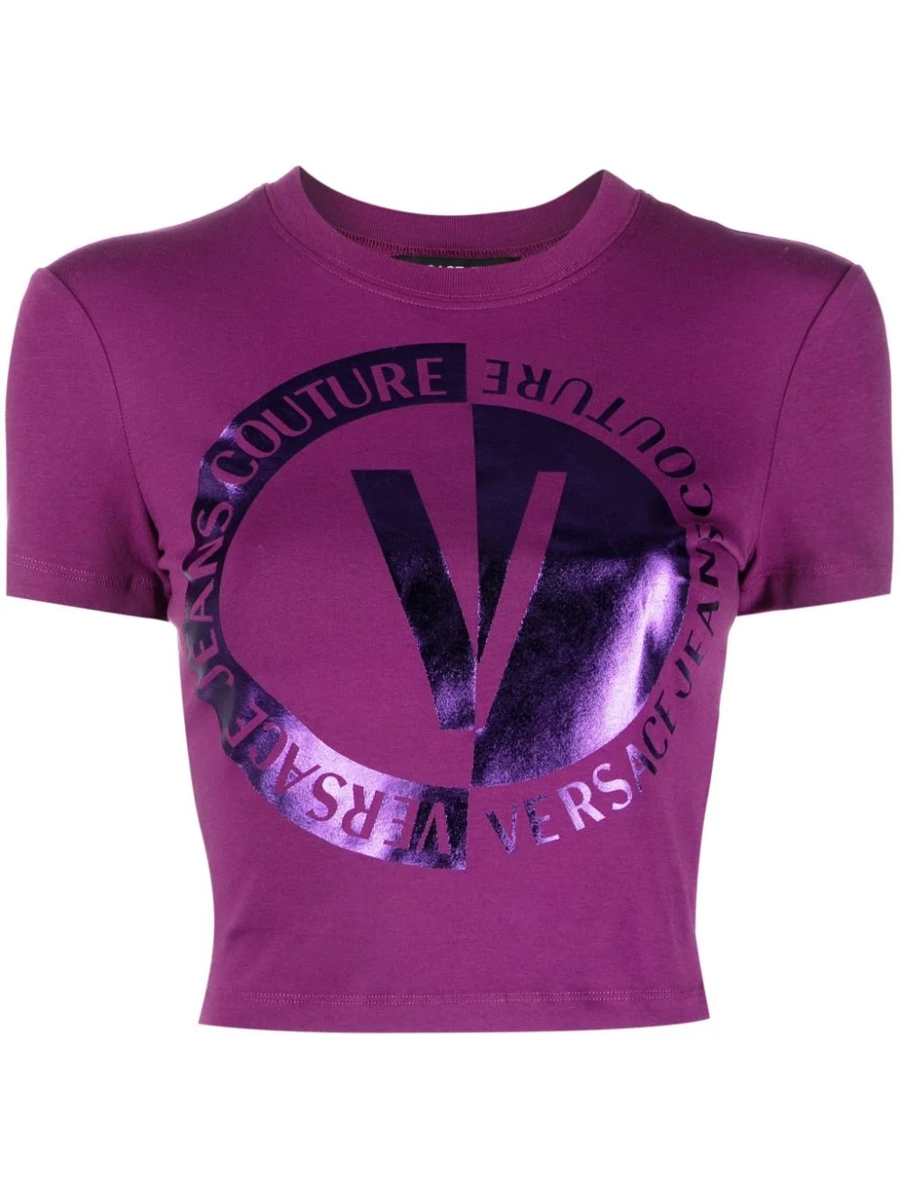 logo-print cropped T-shirt Highlights - Aubergine/lavender purple - Stretch-cotton - Logo print to the front - Metallic finish - Crew neck - Short sleeves - Straight hem - Cropped Imported Composition Cotton 95%, Elastane 5% SIZE & FIT Model measurements Height 5 ft 10 in(1.78 m) Bust/Chest 31.49 in(80 cm) Hips 36.22 in(92 cm) Waist 25.59 in(65 cm) FittingInformation Designed for a slim fit that sits just away from the body offering a close yet comfortable fit Cropped in length Made from a midweight stretch fabric, this piece offers elasticity and flexibility when worn This piece fits true to size – take your usual size