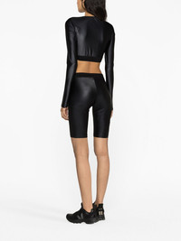 logo-waistband cycling shorts Nodding to classic sportswear styles, these black cycling shorts from Versace Jeans Couture tap into the brand's signature athleisure-inspired take on garments. The pair sits at the waist with an elasticated logo-embellished band whilst falling to an above-knee length. Highlights - Black - Stretch-design - Faux leather - Mid-rise - Elasticated waistband - Above-knee length Made in Italy Composition Polyamide 79%, Elastane 21% SIZE & FIT Model measurements Height 5 ft 10 in(1.78 m) Bust/Chest 31.49 in(80 cm) Hips 35.03 in(89 cm) Waist 23.62 in(60 cm) FittingInformation Designed for a close fit throughout The elasticated waist allows for a comfortable fit Made from a lightweight stretch fabric, this piece offers elasticity and flexibility when worn This piece fits small – take one size up