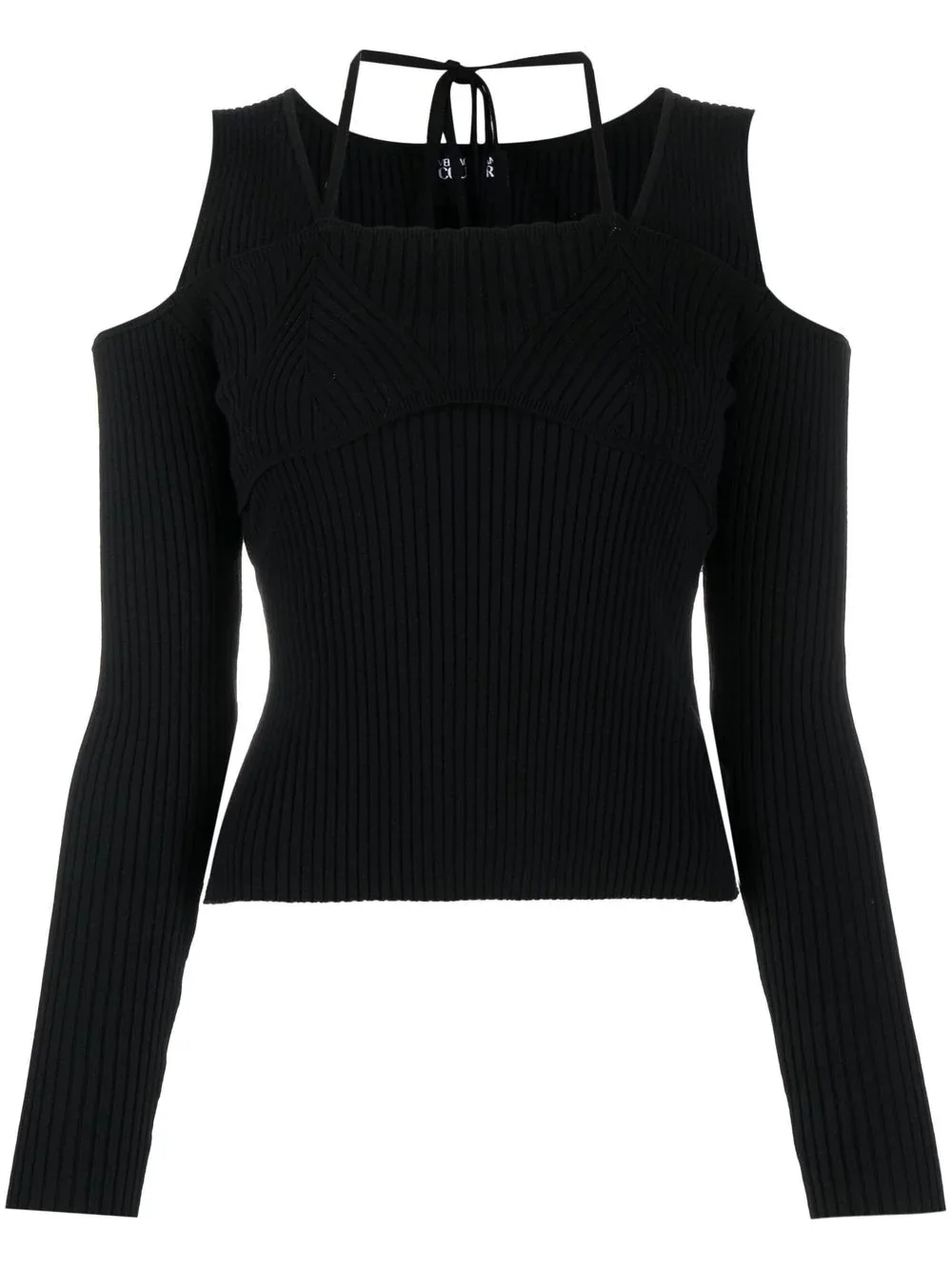 open-shoulder ribbed jumper black stretch-cotton ribbed knit layered design square neck halterneck tie fastening open-shoulder sleeves long sleeves straight hem Imported Composition Cotton 90%, Spandex/Elastane 10% SIZE & FIT Model measurements Height 5 ft 10 in(1.78 m) Bust/Chest 33.07 in(84 cm) Hips 35.82 in(91 cm) Waist 26.96 in(68.5 cm) Measurement SLEEVE LENGTH 20.86 in(53 cm) Shoulder Width 9.44 in(24 cm) LENGTH 18.5 in(47 cm) BUST 22.04 in(56 cm) FittingInformation This piece fits true to size. We recommend you get your regular size Cut for a close fit Made with a mid-weight stretch fabric Washing instructions Hand Wash
