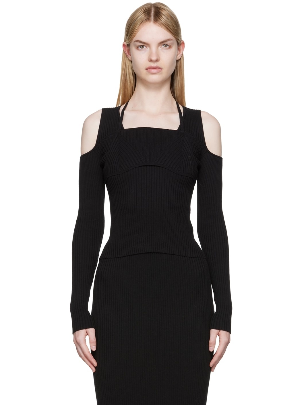 Stretch rib knit cotton sweater. · Layered construction · Square neck · Self-tie halter straps · Cutout at shoulders · Textile logo patch at back Supplier color: Black 90% cotton, 10% elastane.