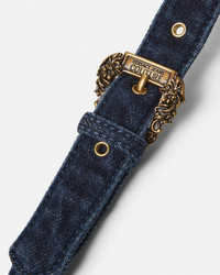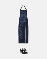 DETAILS This long dress in cotton denim features an allover Outline Barocco motif and Baroque buckles on the crisscross shoulder straps - Outline Barocco motif - Baroque Buckle hardware - Sleeveless - Adjustable shoulder straps - Open back - Back zip closure - Side slit - Outer composition: 98% Cotton, 2% Elastane Item: E78HAO95L-EDW042LP1_E904