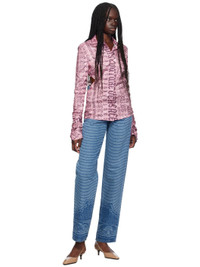 Stretch polyester georgette shirt. Jacquard floral pattern and logo pattern printed throughout. · Faux-pearl button at spread collar · Button closure · Faux-pearl detailing and cutout at side seams · Shirttail hem · Shirring at cuffs Supplier color: Polignac 97% polyester, 3% spandex. Made in Italy 242202F109002