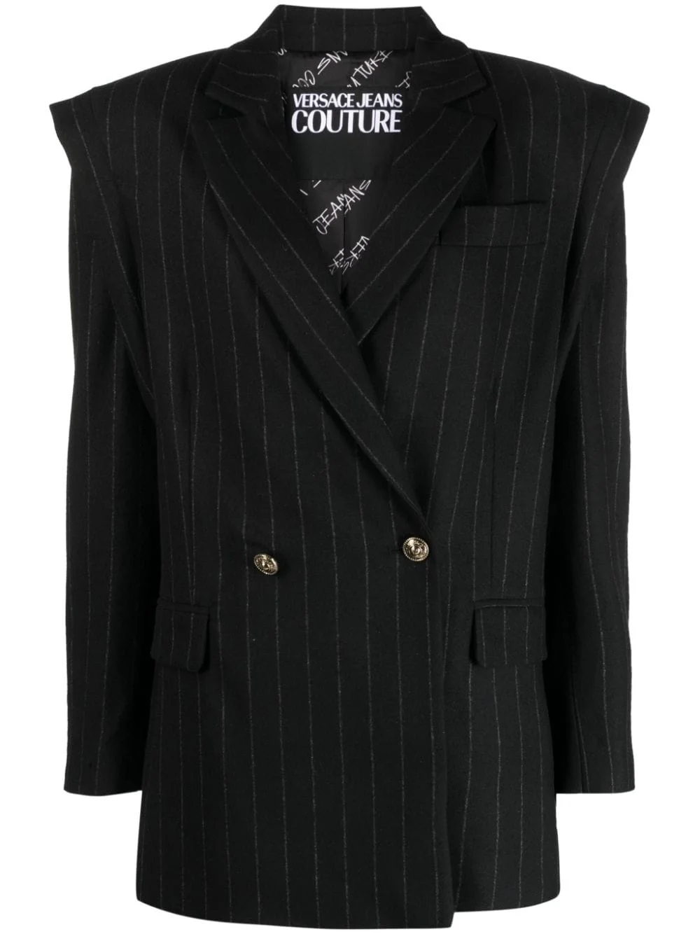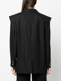 pinstriped double-breasted blazer Highlights - Black - Pinstripe pattern - Notched lapels - Double-breasted button fastening - Shoulder pads - Long sleeves - Buttoned cuffs - Chest welt pocket - Two side flap pockets - Central rear vent - Straight hem Imported Composition Outer: Wool 39%, Polyester 33%, Viscose 14%, Polyamide 13%, Elastane 1% Lining: Polyester 100% SIZE & FIT Model measurements Height 5 ft 11 in(1.8 m) Bust/Chest 31.49 in(80 cm) Hips 36.22 in(92 cm) Waist 25.59 in(65 cm) FittingInformation Designed to be unstructured, offering a loose fit throughout The internal shoulder pads offer a structured shape Made from a midweight fabric This piece fits true to size – take your usual size Washing instructions Dry Clean Only