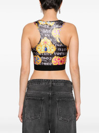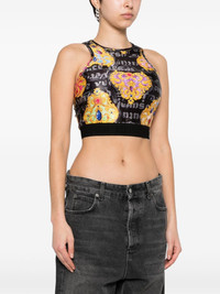 printed cropped top This cropped top encapsulates Versace Jeans Couture's distinctive style with its all-over logo design and baroque-inspired motifs. It's crafted from stretchy fabric for an optimal fit and features a logo-jacquard elasticated underband. Highlights - Black, multicolour - Stretch-design - Technical jersey - All-over logo print - Baroque-pattern print - Round neck - Thin straps - Cropped - Racerback - Unlined - Elasticated logo waistband Imported Composition Polyester 80%, Elastane 20% SIZE & FIT Model measurements Height 5 ft 11 in(1.8 m) Bust/Chest 33.07 in(84 cm) Hips 37 in(94 cm) Waist 25.59 in(65 cm) FittingInformation Designed for a close fit throughout The elasticated waist allows for a comfortable fit Made from a midweight stretch fabric, this piece offers elasticity and flexibility when worn This piece fits true to size – take your usual size Washing instructions Machine Wash