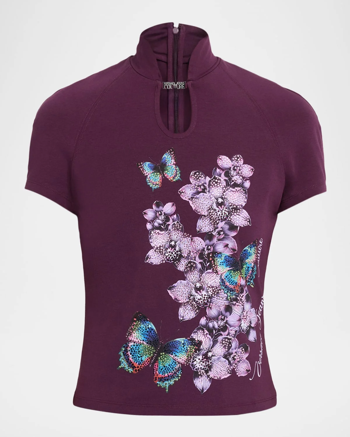 Versace Jeans Couture soft knit top boasts an embellished floral butterfly print and cutout neckline with logo hardware Stand collar Short raglan sleeves Slim fit Hem sits at the hip Center back zip Cotton/elastane Unlined Hand wash or dry clean Imported