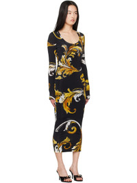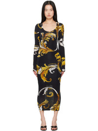 Stretch viscose jersey midi dress. Barocco pattern and logos printed throughout. · Scoop neck · Mesh lining Supplier color: Black/Gold Body: 90% viscose, 10% elastane. Lining: 100% polyamide. Made in Albania 251202F054007