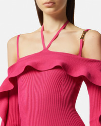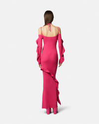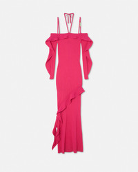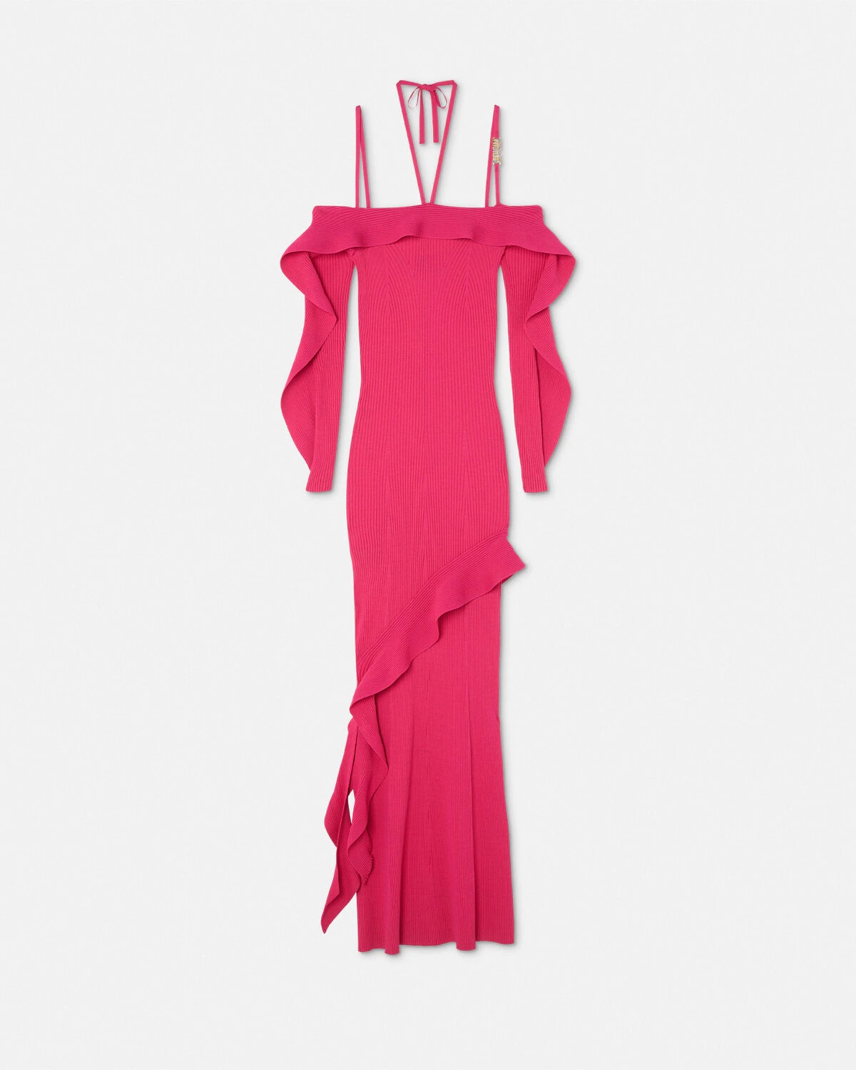 DETAILS A slim fit, stretch ribbed knit long dress with an off-the-shoulder design, featuring ruffled panels at the neckline, sleeves, and hips. Left strap is accented by Institutional logo hardware. - Institutional logo hardware - Off-the-shoulder design - Halterneck - Shoulder straps - Ruffled panels - Outer composition: 70% Viscose, 30% Polyester Item: E76HAOM02-ECMN33_E401 SIZE & FIT - The model is 5'11" tall and wears size S - All sizes fit Italian standards