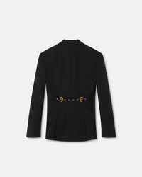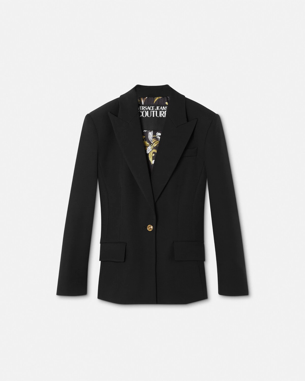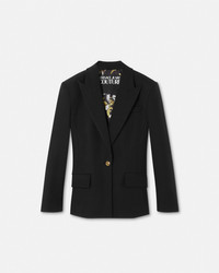 DETAILS A singlebreasted blazer with peaked lapels with accent buttons and a printed Outline Barocco lining - Outline Barocco print - Long sleeves - Peaked lapels - Front button closure - Front flap pockets - Back vent - Outer composition: 49% Viscose, 42% Nylon, 9% Elastane - Lining 1: 100% Polyester - Lining 2: 52% Acetate, 48% Polyester Item: E78HAQ702-EN0356_E899