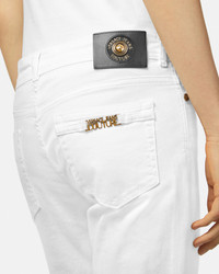 DETAILS These skinny jeans feature a five-pocket-design with a Piece Number logo patch at the front side. They are also detailed with Medusa buttons, a leather logo patch and Institutional logo hardware at the back. - Piece Number logo - Medusa hardware - Belt loops - Five-pocket design - Button and zip closure - Back leather logo patch - Outer composition: 98% Cotton, 2% Elastane Item: E76HAB5K1-ECEW01_E003 SIZE & FIT - The model is 5'10" tall and wears size 26 - All sizes fit Italian standards