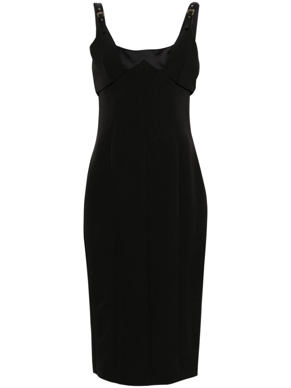 square-neck cady midi dress Cut from stretch cady for a fitted silhouette, Versace Jeans Couture's midi dress is presented in timeless black. The brand's signature Baroque buckles adorn the double shoulder straps for a refined touch. Highlights - Black - Cady texture - Logo-engraved buckle - Square neck - Concealed rear hook and zip fastening - Adjustable shoulder straps - Rear slit - Straight hem - Knee-length - Unlined Made in Italy Composition Lining: Polyester 100% Outer: Polyester 100% SIZE & FIT Model measurements Height 5 ft 11 in(1.8 m) Bust/Chest 34.25 in(87 cm) Hips 35.82 in(91 cm) Waist 24.8 in(63 cm) FittingInformation Designed for a slim fit that sits just away from the body offering a close yet comfortable fit The vented hem offers movement at the rear Made from a midweight non-stretch fabric This piece fits true to size – take your usual size Washing instructions Hand Wash