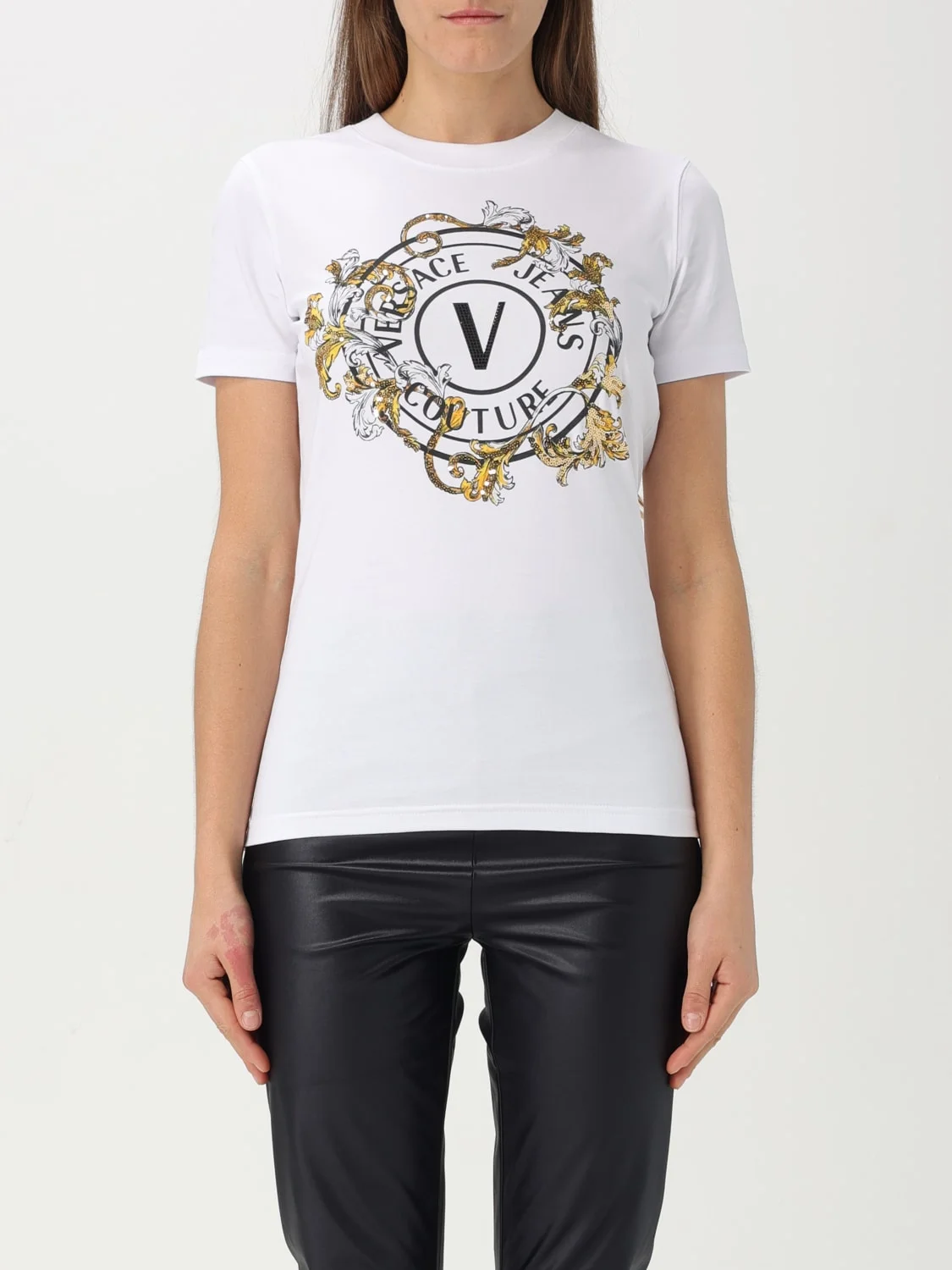 DESCRIPTION - Logo: Print - Model: Crewneck - Neckline: Crewneck - Shoulders: Regular - Sleeves: Short - Bottom: With straight hemline - Materials: Cotton - Pattern: Baroque Versace DETAILS AND CARE Composition 100co SIZE AND FIT Sizes not available Size and fit Slim fit Designer code: 78HAHC01CJ02C G03 Giglio Code: G59730 Designer: Versace Jeans Couture Collection: Versace Jeans Couture Woman Category: Clothing Versace Jeans Couture