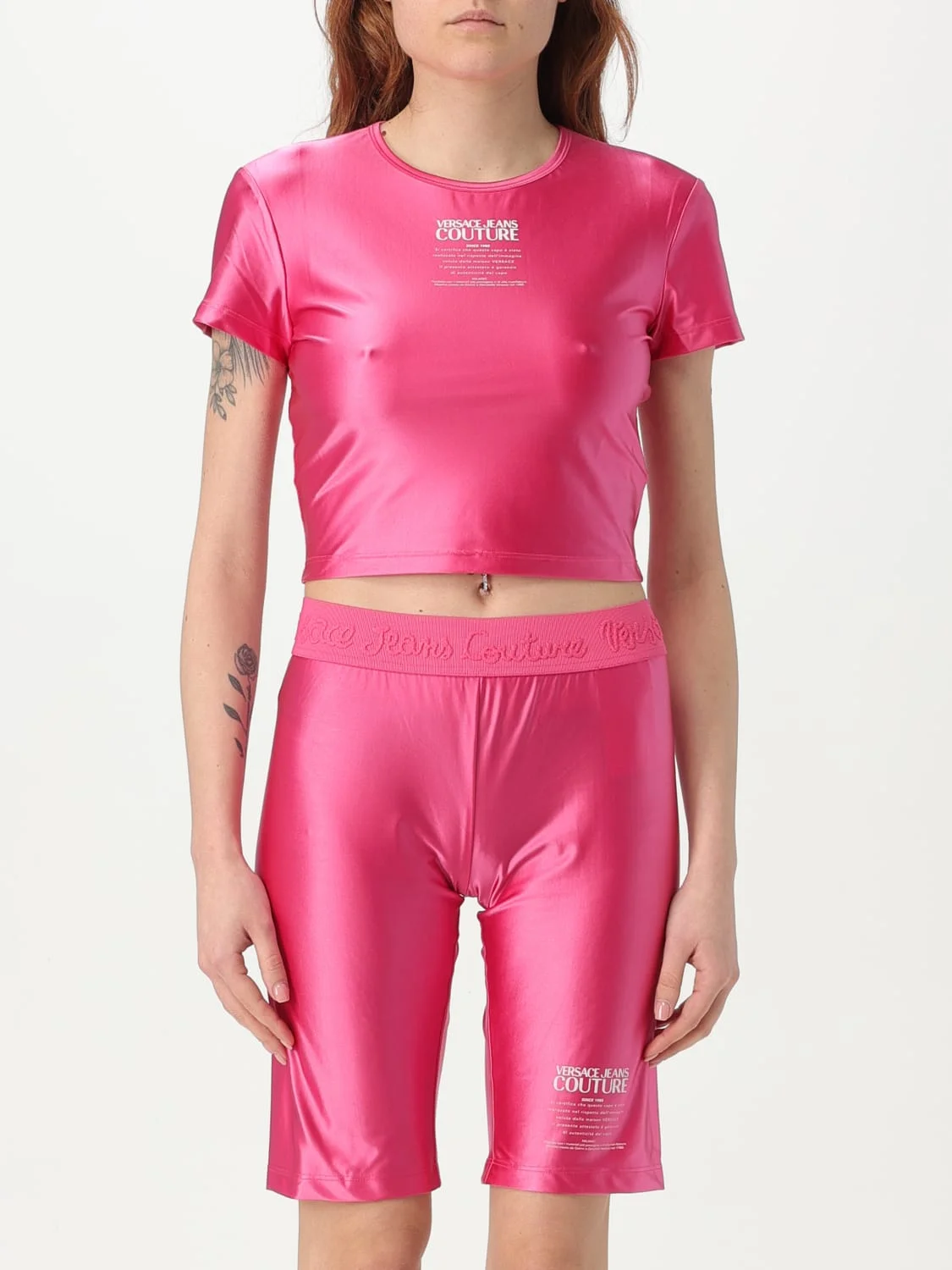 DESCRIPTION - Style: Sporty - Logo: Print - Model: Crewneck - Neckline: Crewneck - Shoulders: Regular - Sleeves: Short - Bottom: With straight hemline - Materials: Technical fabric - Pattern: Logo DETAILS AND CARE Composition not available SIZE AND FIT Sizes not available Size and fit Slim fit Designer code: 78HAH6A2J0223 494 Giglio Code: G59741 Designer: Versace Jeans Couture Collection: Versace Jeans Couture Woman Category: Clothing Versace Jeans Couture