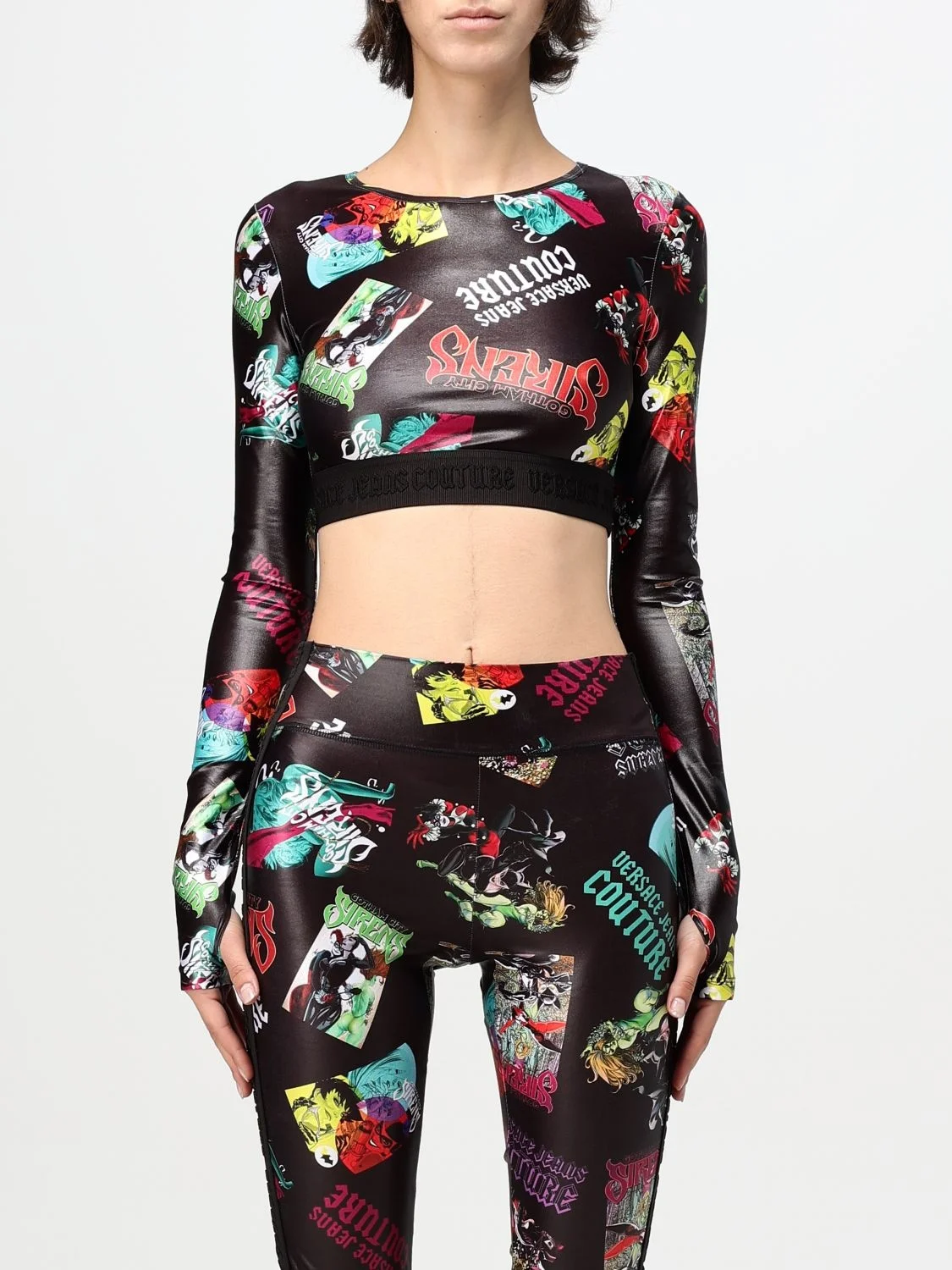 DESCRIPTION - Logo: Contrasting - Neckline: Crewneck - Sleeves: Long - Bottom: With straight hemline - Materials: Polyester - Pattern: Graphic DETAILS AND CARE Composition TESSUTO 1:80%PL,20%EA - SIZE AND FIT Sizes not available Size and fit Cropped fita Designer code: 77HAH2S8JS412 899 Giglio Code: G06001 Designer: Versace Jeans Couture Collection: Versace Jeans Couture Woman Category: Clothing Versace Jeans Couture