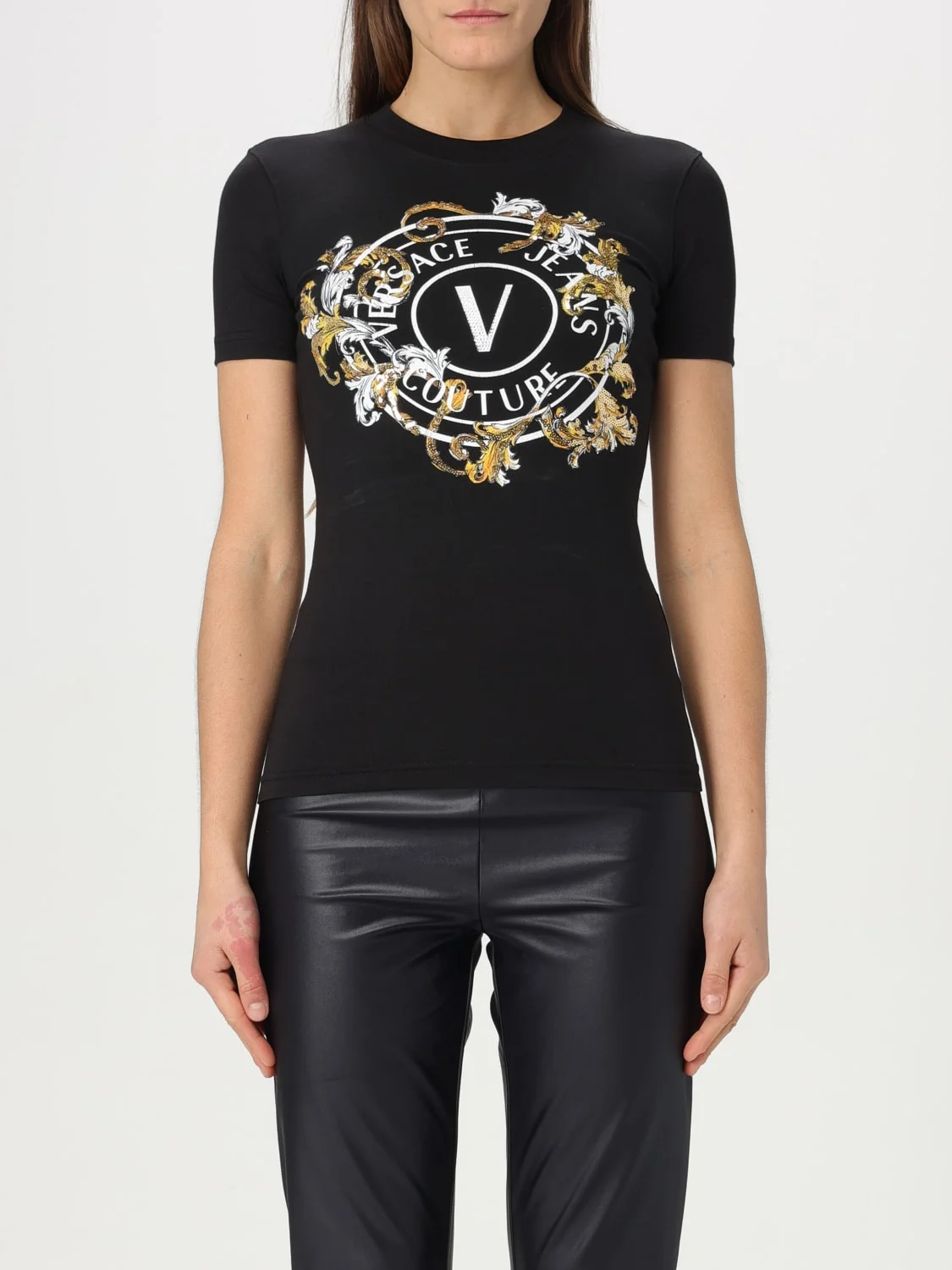 DESCRIPTION - Logo: Print - Model: Crewneck - Neckline: Crewneck - Shoulders: Regular - Sleeves: Short - Bottom: With straight hemline - Materials: Cotton - Pattern: Baroque Versace DETAILS AND CARE Composition 100co SIZE AND FIT Sizes not available Size and fit Slim fit Designer code: 78HAHC01CJ02C G89 Giglio Code: G59730 Designer: Versace Jeans Couture Collection: Versace Jeans Couture Woman Category: Clothing Versace Jeans Couture