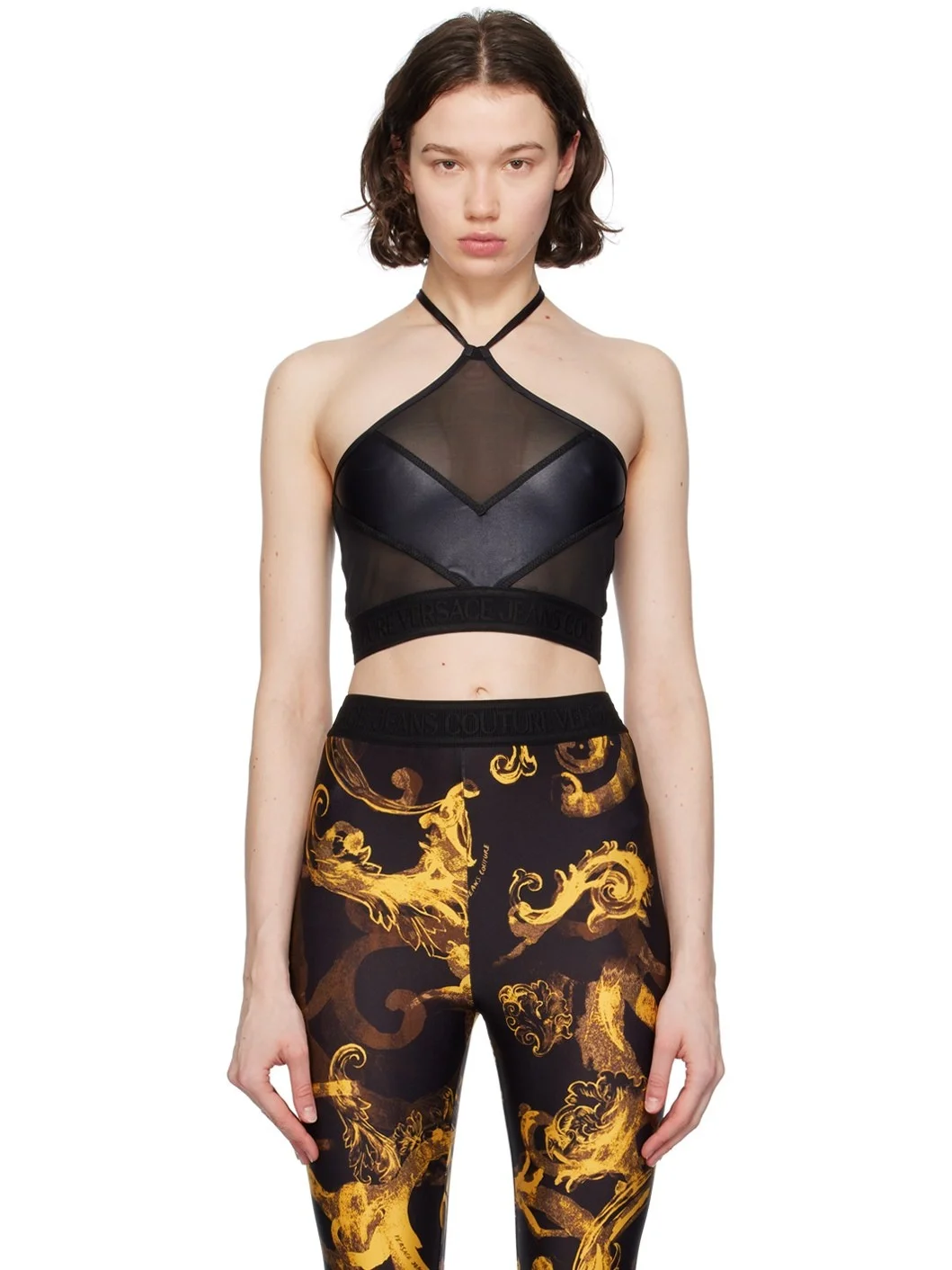 Stretch nylon mesh and stretch nylon satin jersey tank top · Paneled construction · Halter neck · Logo-woven elasticized hem Supplier color: Black Body 1: 79% polyamide, 21% elastane. Body 2: 87% polyamide, 13% elastane. Made in Italy 241202F111013