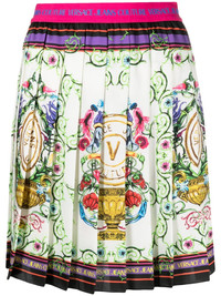 V-Emblem Garden miniskirt A prime example of Versace Jeans Couture's maximalist aesthetic, the V-Emblem Garden print elevates this miniskirt with its bold florals and emblems. The fuchsia-pink logo-print waistband adds further drama. Highlights - White/multicolour - Signature barocco print - Logo-print edge - Logo waistband - All-over floral print - Elasticated waistband - Fully pleated - Straight hem - Above-knee length Made in Italy Composition Polyester 100% SIZE & FIT Model measurements Height 5 ft 10 in(1.78 m) Bust/Chest 29.92 in(76 cm) Hips 34.64 in(88 cm) Waist 23.62 in(60 cm) FittingInformation This mini-length skirt is intended to be worn high on the waist The elasticated waist allows for a comfortable fit Made from a midweight non-stretch fabric, this piece offers minimal elasticity when worn This piece fits true to size – take your usual size Washing instructions Dry Clean Only