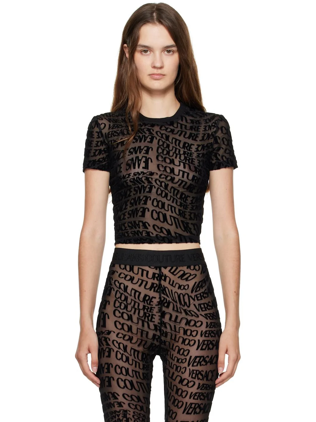Sheer stretch mesh T-shirt. · Logo pattern flocked throughout · Rib-knit crewneck · Cropped hem Supplier color: Black Body: 96% polyester, 4% elastane. Trim: 100% polyamide. Made in Albania 252202F110018