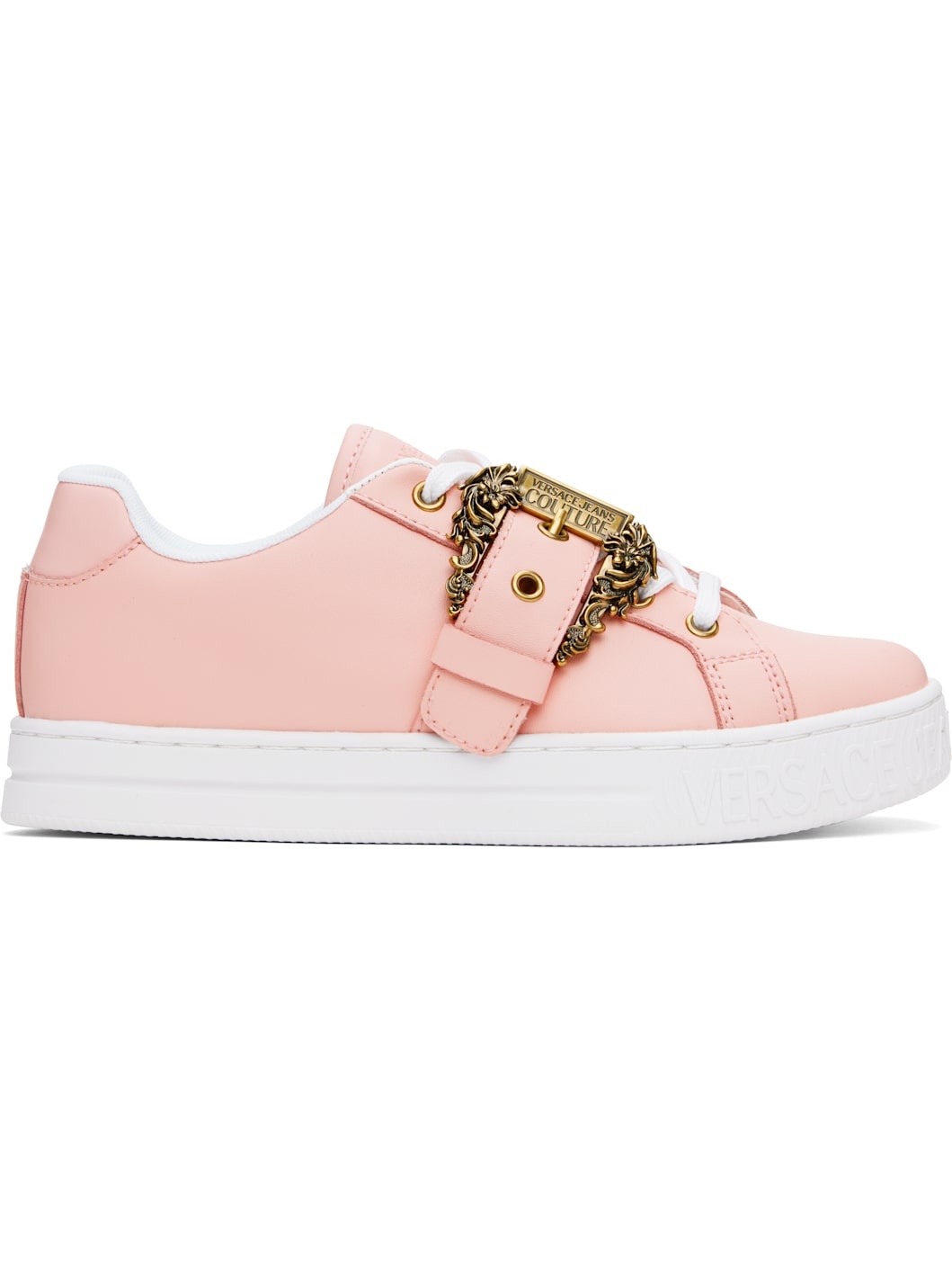 Low-top buffed leather sneakers in pink. · Pin-buckle strap at vamp · Lace-up closure · Logo embossed at padded tongue · Padded collar · Mesh lining · Logo-embossed rubber midsole · Treaded rubber sole Supplier color: Pink Upper: calfskin. Sole: rubber. Made in China 251202F128004
