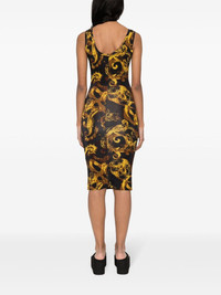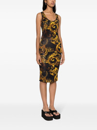 Watercolour Couture-print midi dress Versace Jeans Couture gives a watercolour effect to its signature Barocco motif. Printed all over this dress, it contrasts with the black background. Highlights - Black, yellow - Stretch-design - All-over signature watercolour couture print - Scoop neck - Sleeveless - Internal logo tag - Unlined - Mid-length - Straight hem Made in Italy Composition Viscose 90%, Spandex/Elastane 10% SIZE & FIT Model measurements Height 5 ft 9 in(1.76 m) Bust/Chest 31.1 in(79 cm) Hips 36.61 in(93 cm) Waist 24.8 in(63 cm) FittingInformation Designed for a close fit throughout Made from a midweight stretch fabric, this piece offers elasticity and flexibility when worn This piece fits true to size – take your usual size Washing instructions Machine Wash