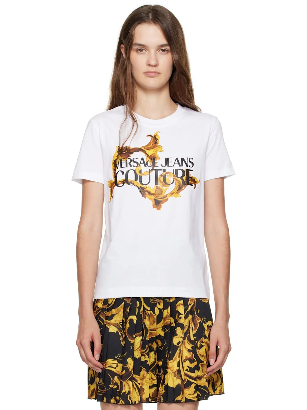 Cotton jersey T-shirt. · Rib-knit crewneck · Logo printed at front Supplier color: White/Gold 100% cotton. Made in Egypt 252202F110016