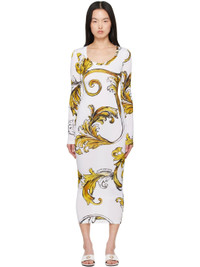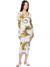 Stretch viscose jersey midi dress. Barocco pattern and logos printed throughout. · Scoop neck · Mesh lining Supplier color: White/Print Body: 90% viscose, 10% elastane. Lining: 100% polyamide. Made in Albania 251202F054008