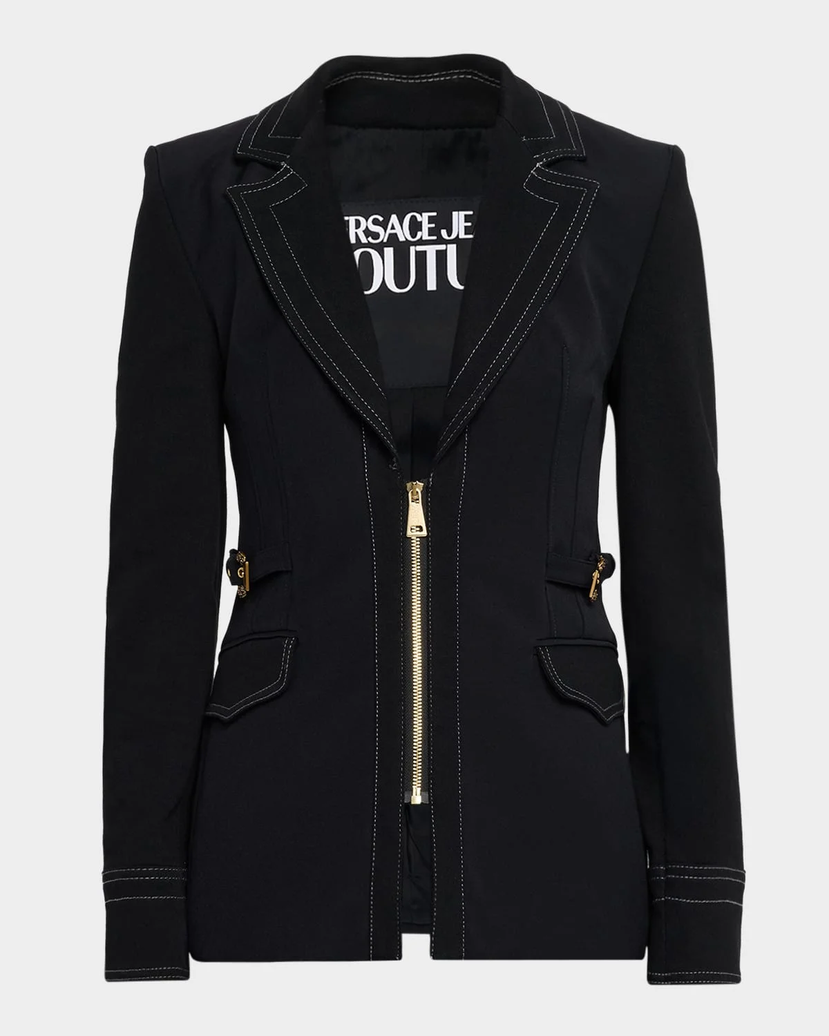 Crafted from stretch denim, this Versace Jeans Couture jacket is adorned with adjustable waist buckles and contrast topstitching for a bold silhouette. Notch lapels Structured shoulders Long sleeves Hip flap pockets Straight fit Zipfront Cotton/elastane Lining: Acetate Hand wash or dry clean Imported