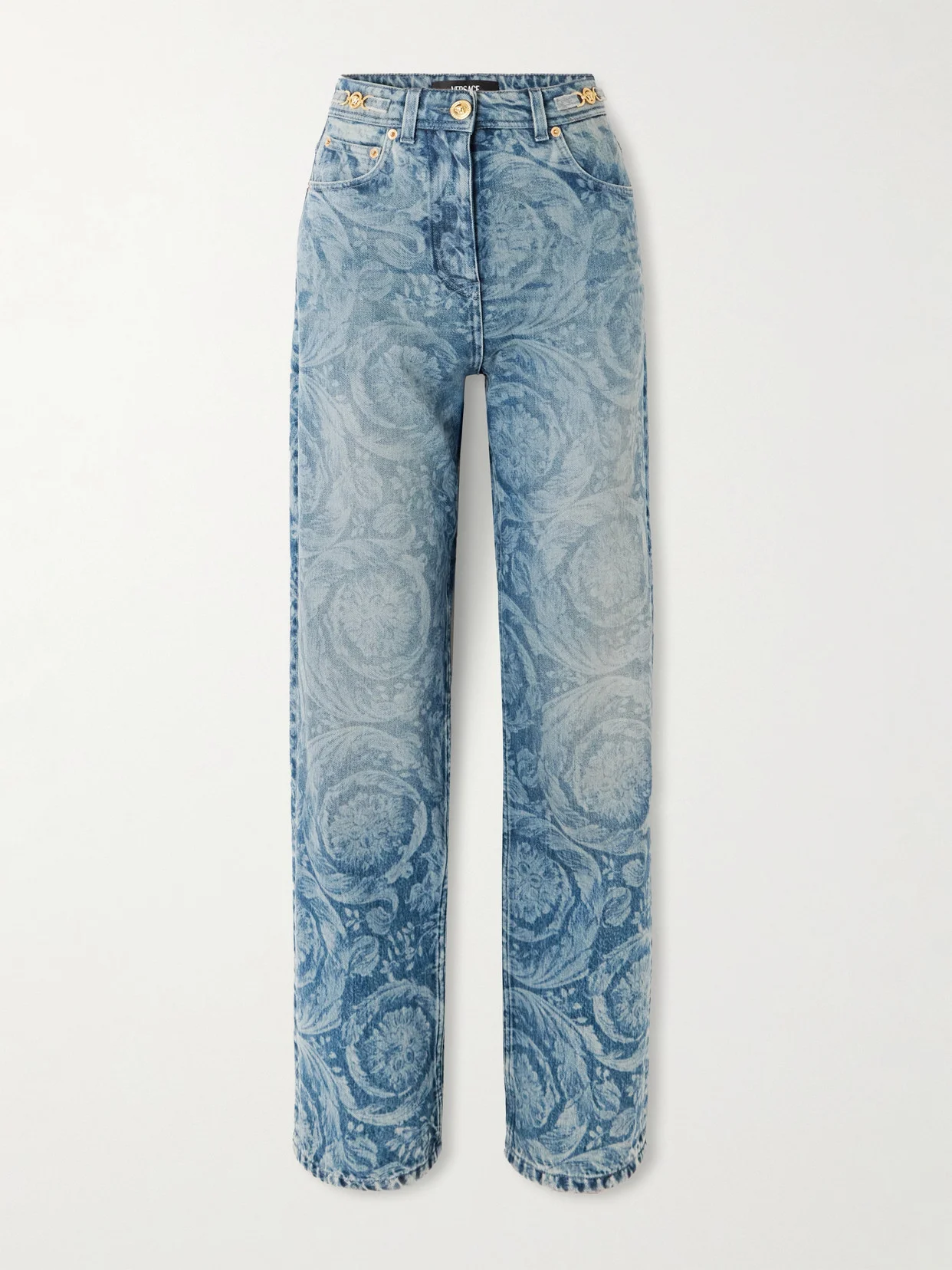 Versace's jeans are laser-printed with the label's signature 'Barocco' motif. They have a high waist and straight legs with the 'Medusa' hardware nestled between belt loops.