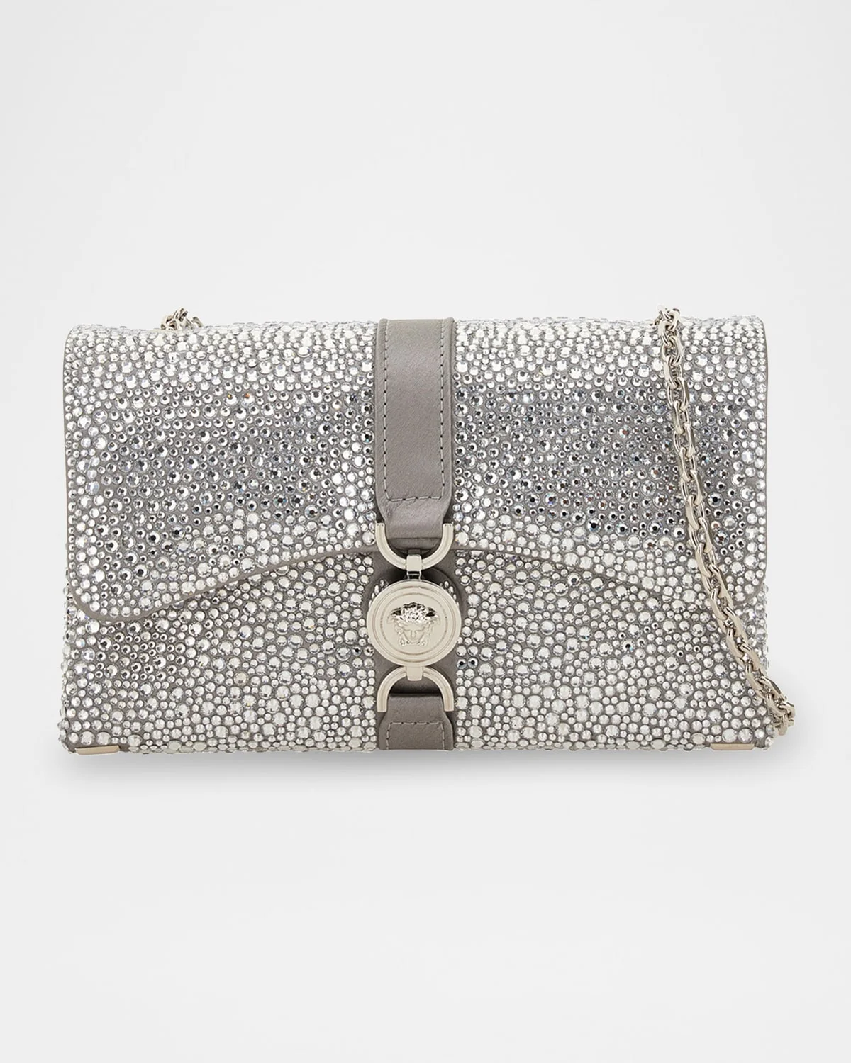 - Versace "Kleio" mini shoulder bag in viscose-silk fabric glitters all over with crystal applique - Detachable chain shoulder strap - Can be worn as a clutch or shoulder bag - Flap top with Medusa '95 magnetic closure - Divided interior, one slip pocket - Lining: Viscose - Trim: Leather - Approx. 4.7"H x 7.5"W x 2.4"D - Made in Italy