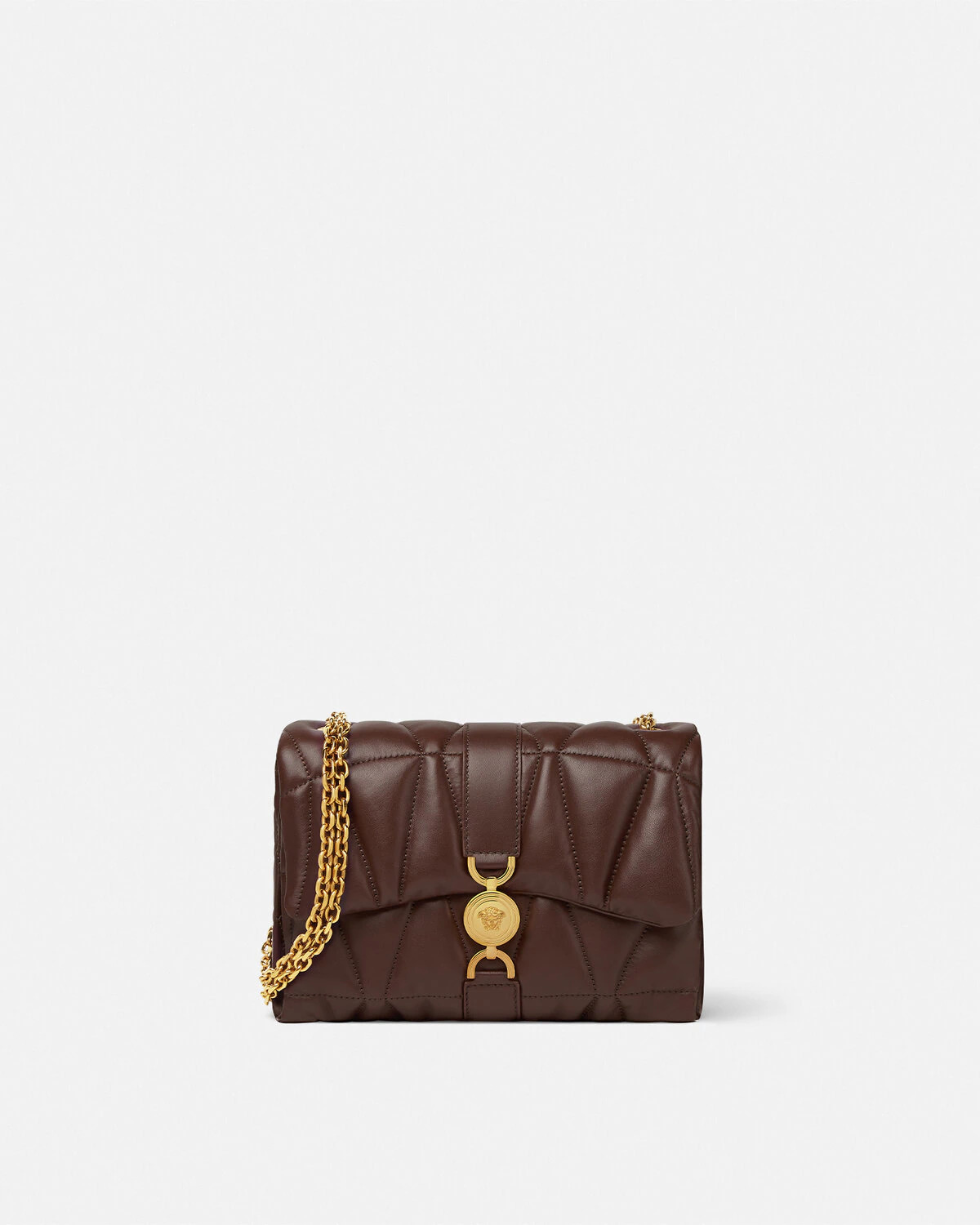 DETAILS The Kleio shoulder bag is crafted from quilted nappa leather with a soft pillowlike appearance and feel The line is characterised by the Houses signature Medusa 95 lock closure and is enriched by a double chain shoulder strap that can be adjusted for shoulder or crossbody ways of wearing - Medusa '95 hardware - Foldover flap - Interior slip compartments - Magnetic interlocking closure - Adjustable chain shoulder straps - Outer composition: 100% Lambskin - Lining: 100% Lambskin Item: 1015964-1A12973_1ND3V SIZE & FIT - L8.7 x W3.5 x H6.5" / L22 x W9 x H16.5 cm - Shoulder strap: L24.4-39.4" / L62-100 cm - Shoulder drop: L10.8-20.1" / L27.5-51 cm - Approximate weight: 17.6 oz / 0.5 kg